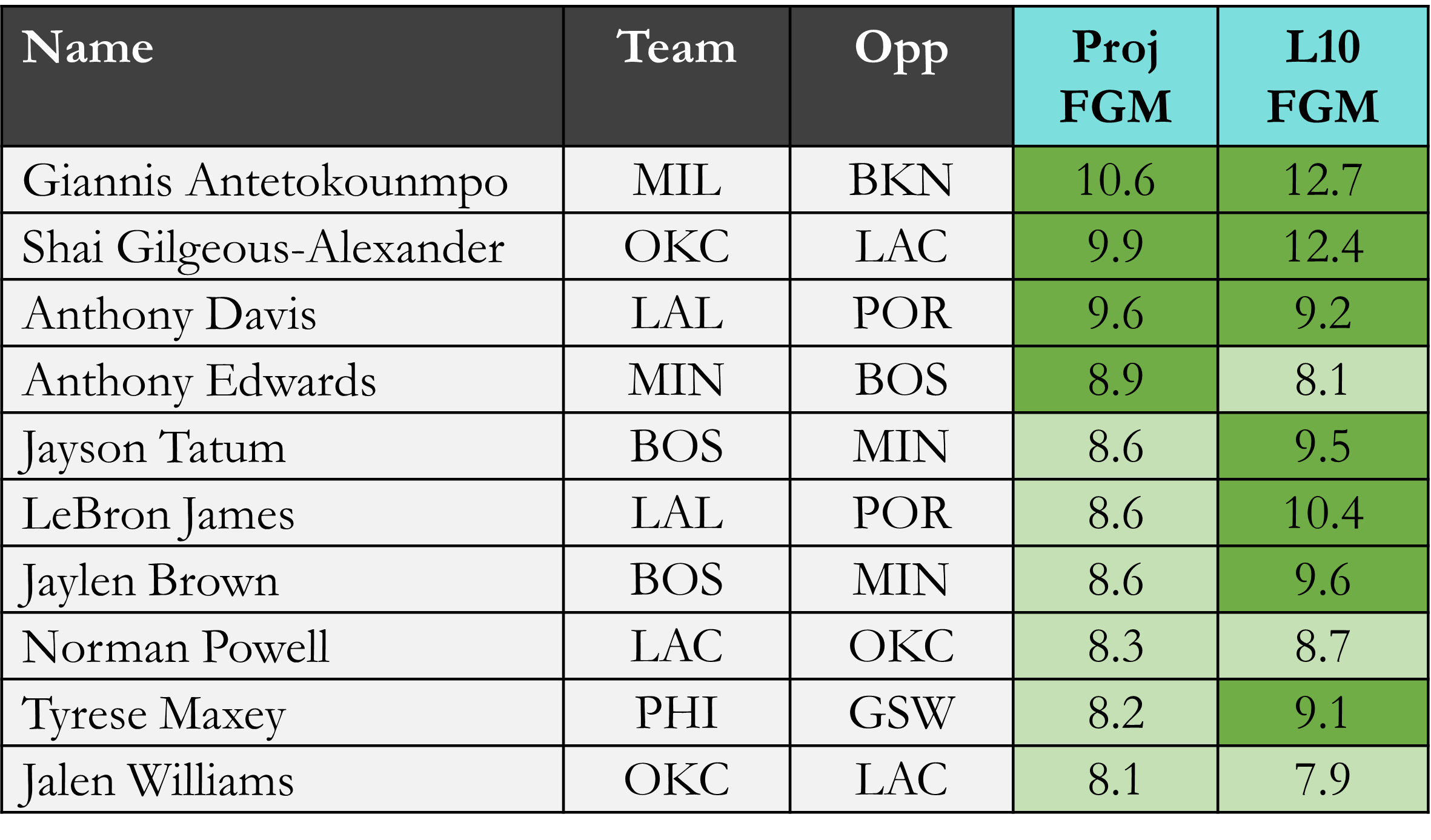 Top players in projected field goals made and +/- according to Rotowire & NBA.com, which is available in the table(s) below. Overall rank is based on daily projections, last 10 games, and rest of season projections, which is stack ranked amongst peers for each objective. When there is a single objective, the three data points are still used to stack rank the players vs. ranking solely on projections. For tome+ subscribers, projected rest-of-season stats are available in the provided data file. Omission of certain players would be based on injuries at the time of data pull.