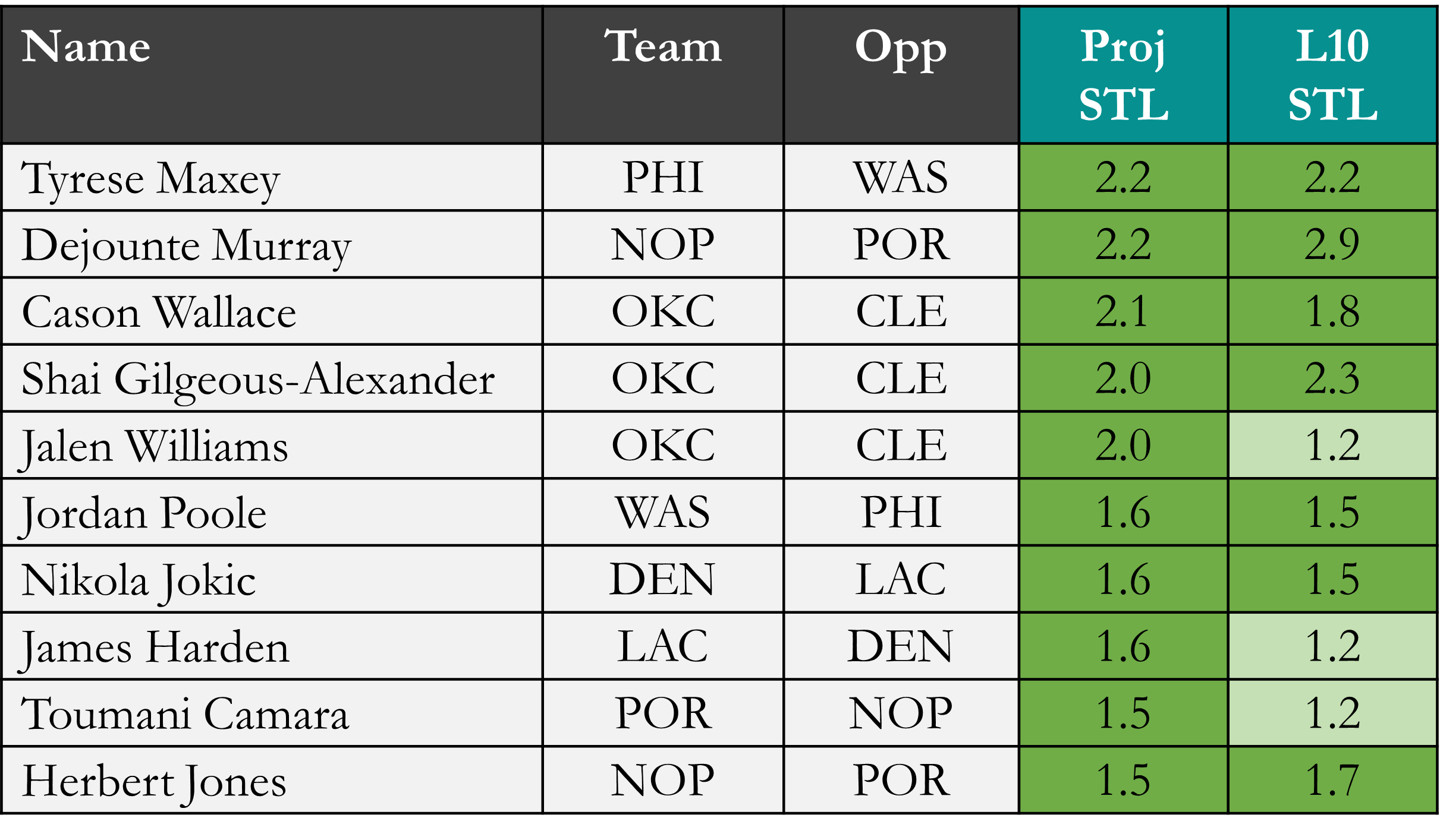 Top players in projected assists & steals according to Rotowire & NBA.com, which is available in the table(s) below. Overall rank is based on daily projections, last 10 games, and rest of season projections, which is stack ranked amongst peers for each objective. When there is a single objective, the three data points are still used to stack rank the players vs. ranking solely on projections. For tome+ subscribers, projected rest-of-season stats are available in the provided data file. Omission of certain players would be based on injuries at the time of data pull.