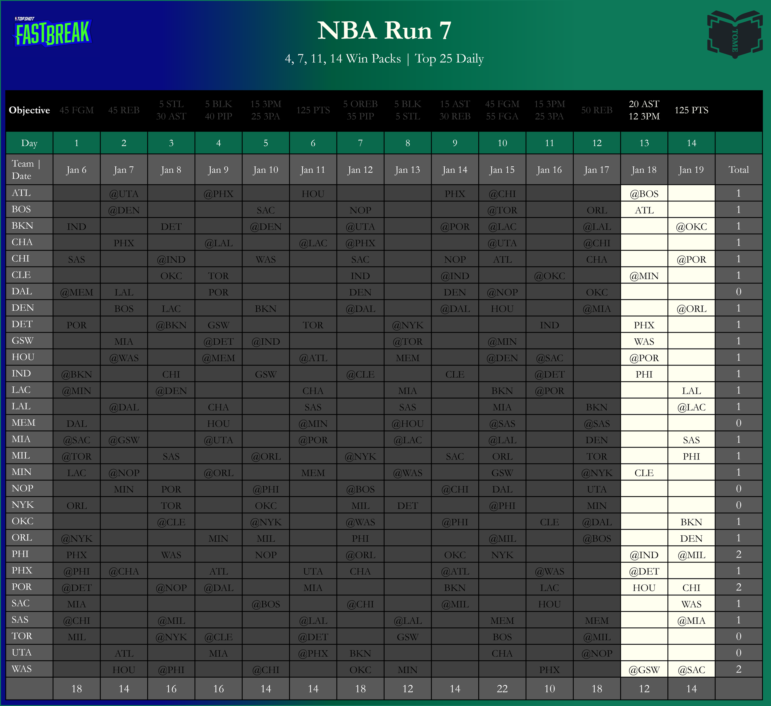 Day 13 had more potential for more wins than what we saw the previous two days, but some key poor performance sunk the majority of lineups where only 18% walked away unscathed - plus this point of Fast Break typically sees tighter and more varied lineups which leads to more varied outcomes. As we approach the final two days of this run and prepare for Run 8 (which is live), it is a great opportunity to either finish strong for the next reward or to carry the momentum into the next series. It’s worth noting Run 8 will span only eleven (11) games and win-based rewards will require 3, 6, 9, and 11 which means your room for error is razor thin and you’ll need all the extra oomph to stake your claim for the available rewards.