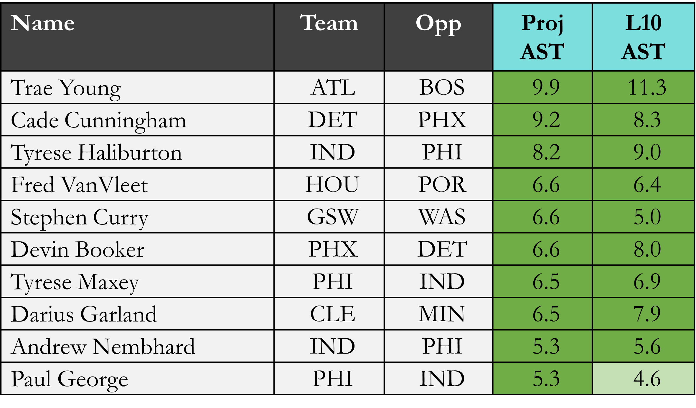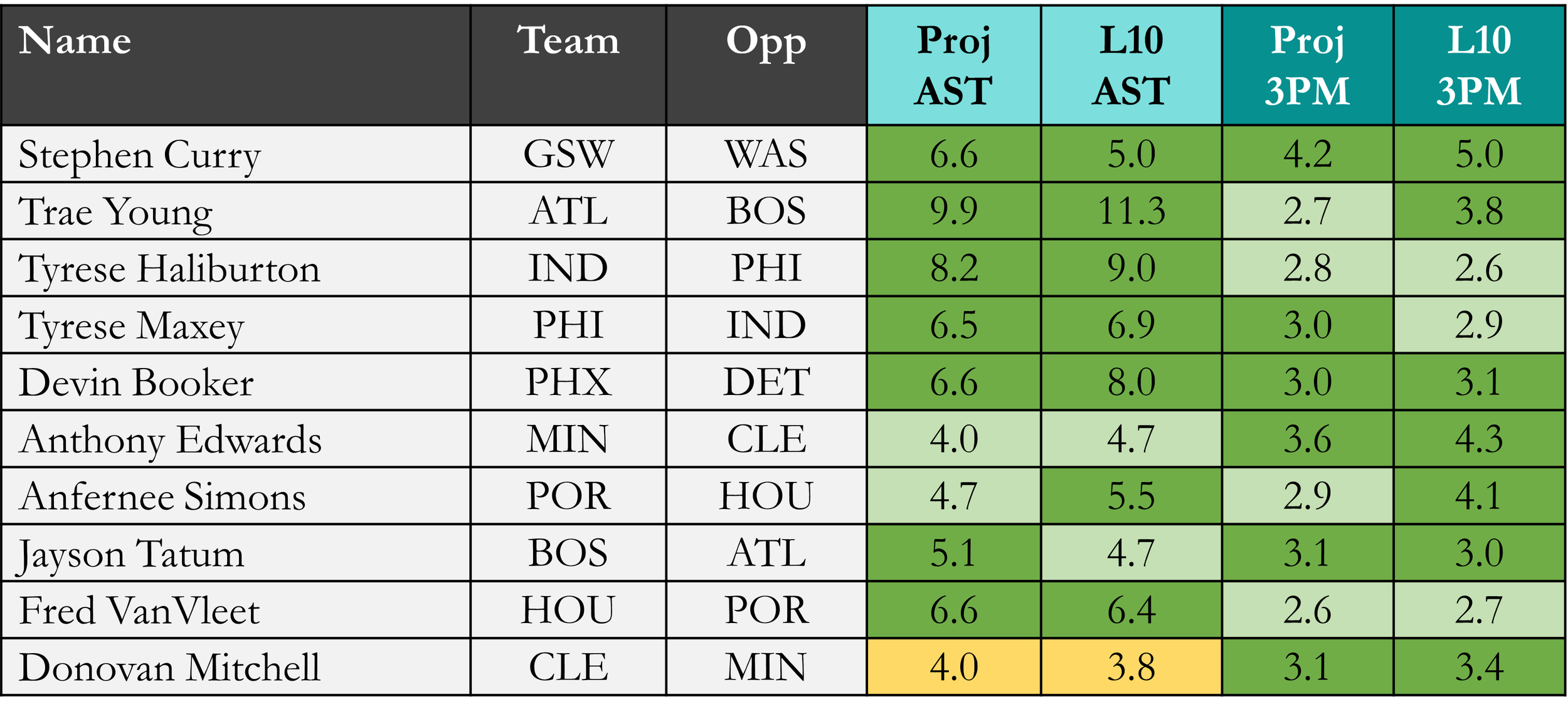 Top players in projected assists & three pointers made according to Rotowire & NBA.com, which is available in the table(s) below. Overall rank is based on daily projections, last 10 games, and rest of season projections, which is stack ranked amongst peers for each objective. When there is a single objective, the three data points are still used to stack rank the players vs. ranking solely on projections. For tome+ subscribers, projected rest-of-season stats are available in the provided data file. Omission of certain players would be based on injuries at the time of data pull.