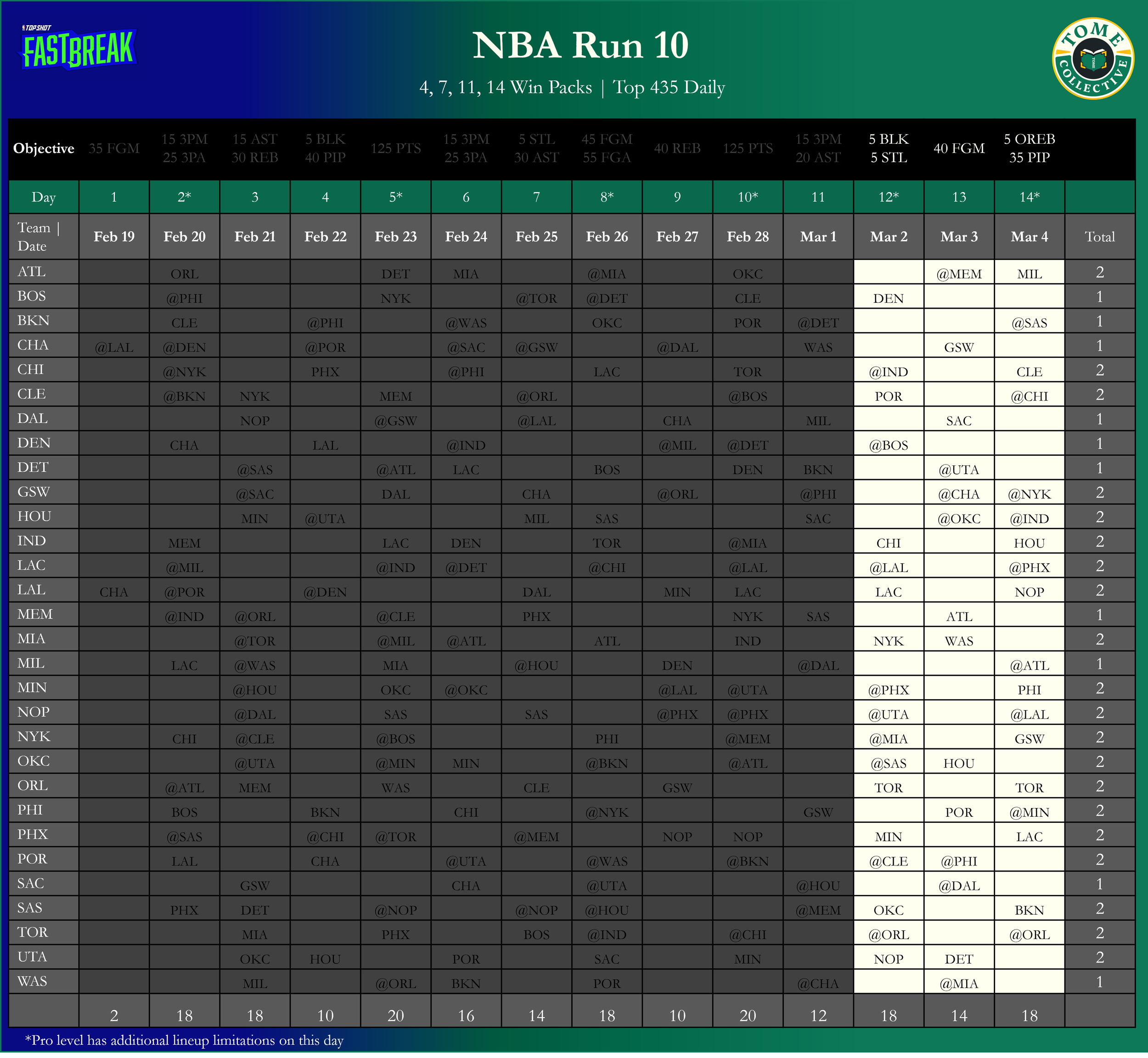 4, 7, & 11 wins: One (1) Fast Break Pack (per tier)