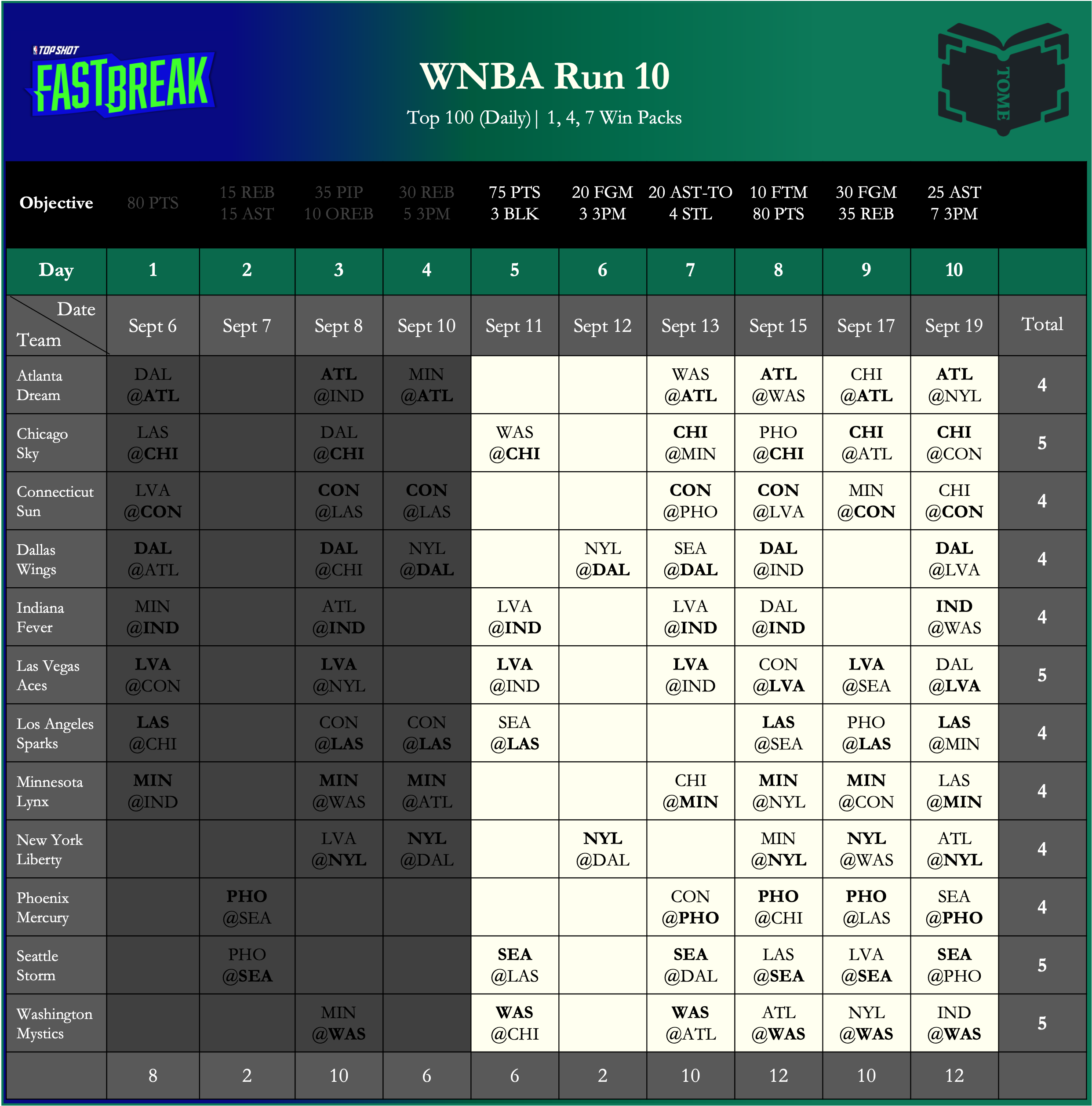 As we wind down the WNBA Season, the end of Run 10 is about a week away and securing another win will get you one step closer to that top pack. Let’s dive into today’s objectives.