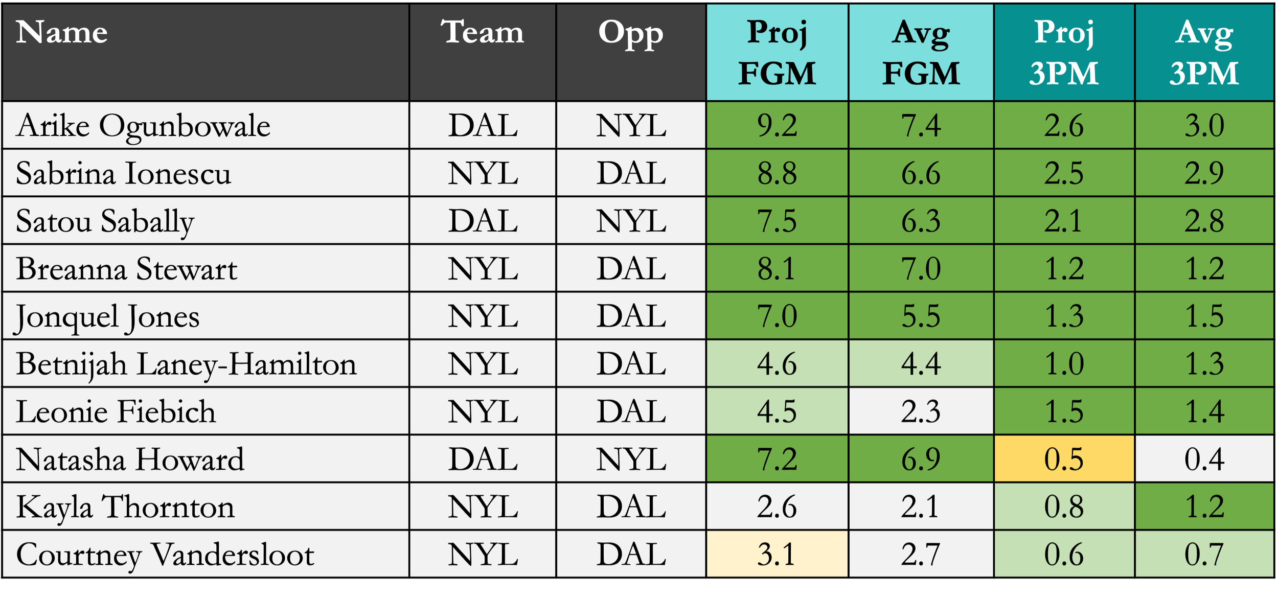 Fast Break Day 6 requires five (5) players who will make 20 or more Field Goals and sink 3 or more Three Pointers, which means your lineup will need an average of 4.0 FGM and 0.6 3PMs per player. As theres two stats overlap (one 3PM = one FGM), you have many players who can fill both buckets simultaneously. The challenge, though, is the limited number of players in action today. If you did not plan ahead and saved players like Arike Ogunbowale, Sabrina Ionescu, and/or Breanna Stewart, you’ll have a challenging day ahead. Read ahead if you want to see the data or review the player lists by tier below.