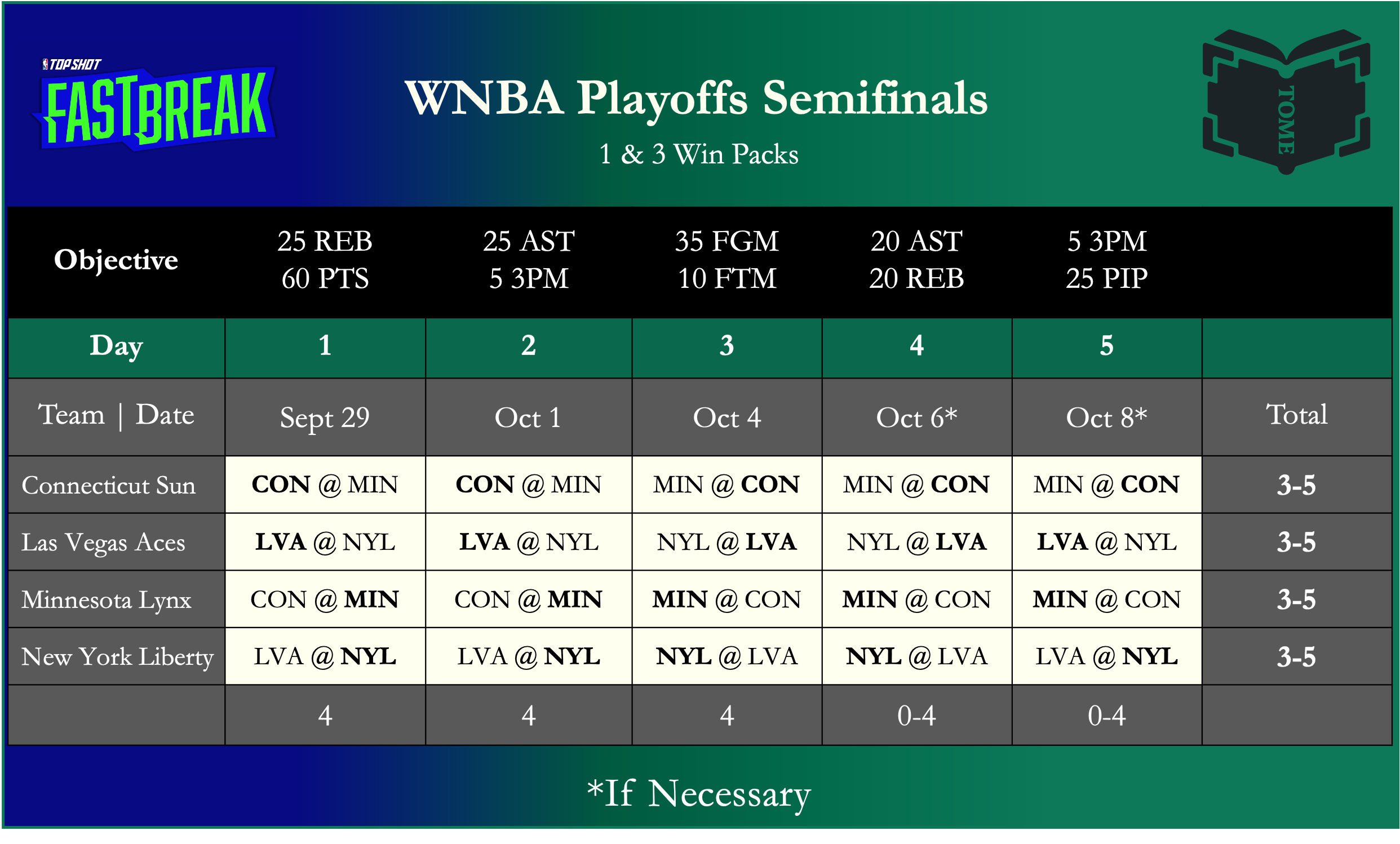 The WNBA Fast Break Playoff Semifinals will also require more strategy. Do you aim for the three (3) wins and use your best players available, do you save your players to maximize your odds for the daily reward, or do you spread out your players based on day (using Witty’s Cheat Sheet) to increase your chances of placing for the run-based rewards? There’s no right answer and will depend on your collection and the duration of this playoff round (schedule below):