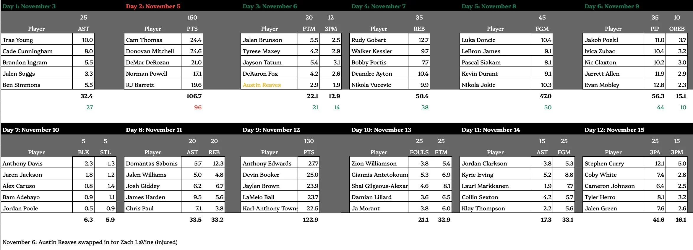 We are officially at the midway point of this run, which has proven to be quite challenging for many. As of today, we are down to 16 of 7,300+ who are a perfect 6 of 6. There were only eight (8) teams in action, but there was a build-up of suspense as two of the top five most used players were involved in the final game (Zubac & Poeltl). Zubac lived up to expectations whereas Poeltl, Jarrett Allen, and a handful of others left a lot to be desired. If you were one of the 34% of participants who included Clint Capela, you were rewarded with his 5 OREB, 16 PIP performance. Evan Mobley was not one of the most heavily used players, but he chipped in 3 OREB & 18 PIP during a big comeback win for Cleveland who won their 11th of the season. It’ll be worth watching whether they sustain this momentum throughout the season and prove they’re contenders to come out of the East, which will likely run through Boston again. Circle your calendar for Tuesday, November 19th when these two teams meet in the NBA Cup Group stage.