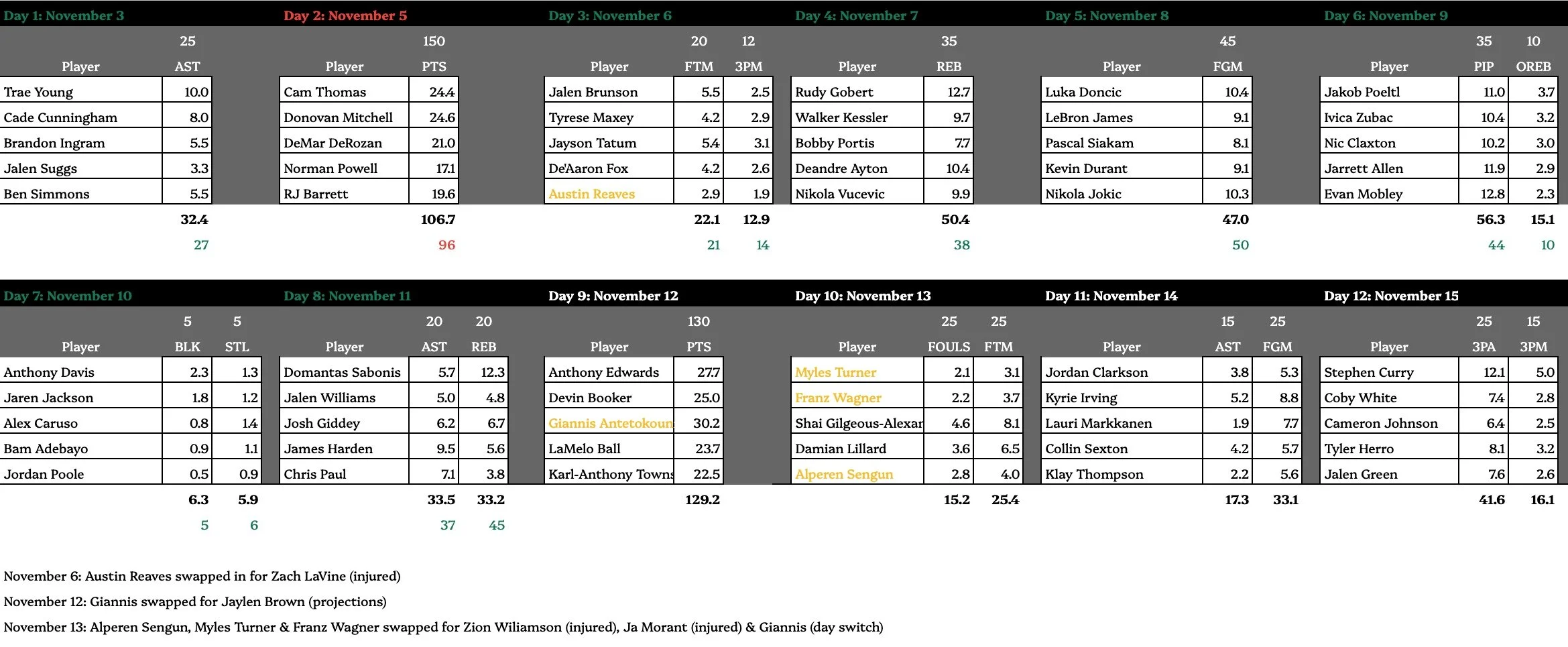 Although Karl-Anthony Towns is projected to score about 22 points and has averaged 25 points on the season, he has scored over 30 points in three straight games so recency bias explains why he is the most heavily utilized in lineups today. On the other hand, Giannis is projected to be the highest scorer of the day and has exceeded 30 points in 6 of his first 9 games whereas his counterpart Damian Lillard has exceeded 25 points in 6 of his last 10 games, but it is worth noting that he has had two straight games where he did not crest 20 points. In the past 10 games, Jayson Tatum has exceeded 25 points in 9 of 10 games, LaMelo in 8 of 10, Luka in 7 of 10, Ant in 4 of 10, and Brunson in 4 of 10.With Kevin Durant sidelined for the next two weeks, Devin Booker is projected to have a high scoring day, but he has exceeded 25 points only 3 of 10 times this season. Lastly, Curry, Embiid, & Jaylen Brown have the capability to deliver a high scoring day, but they are less predictable considering their recent injuries (Embiid is expected to make his season debut today).
