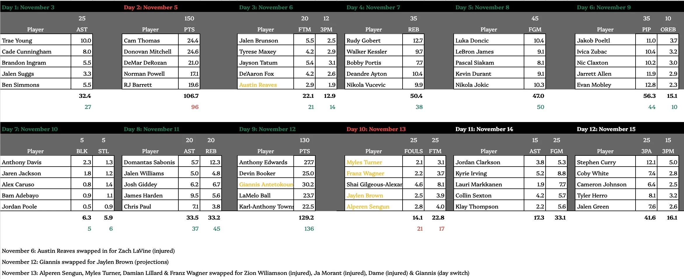 Of the top five players utilized, DeMar DeRozan left the game due to lower back tightness and SGA only had 3 fouls drawn and 2 free throws made, which likely led to the low win percentage on Day 10. Sengun was the 6th most utilized player and although he had a decent statistical day (double-double), he drew no fouls and made no free throws. Ouch. If, however, you had Giannis in your lineup, he covered half of the fouls drawn and 64% of the free throws you needed. If you were one of the 30% who won, chances are you had Giannis in your lineup.