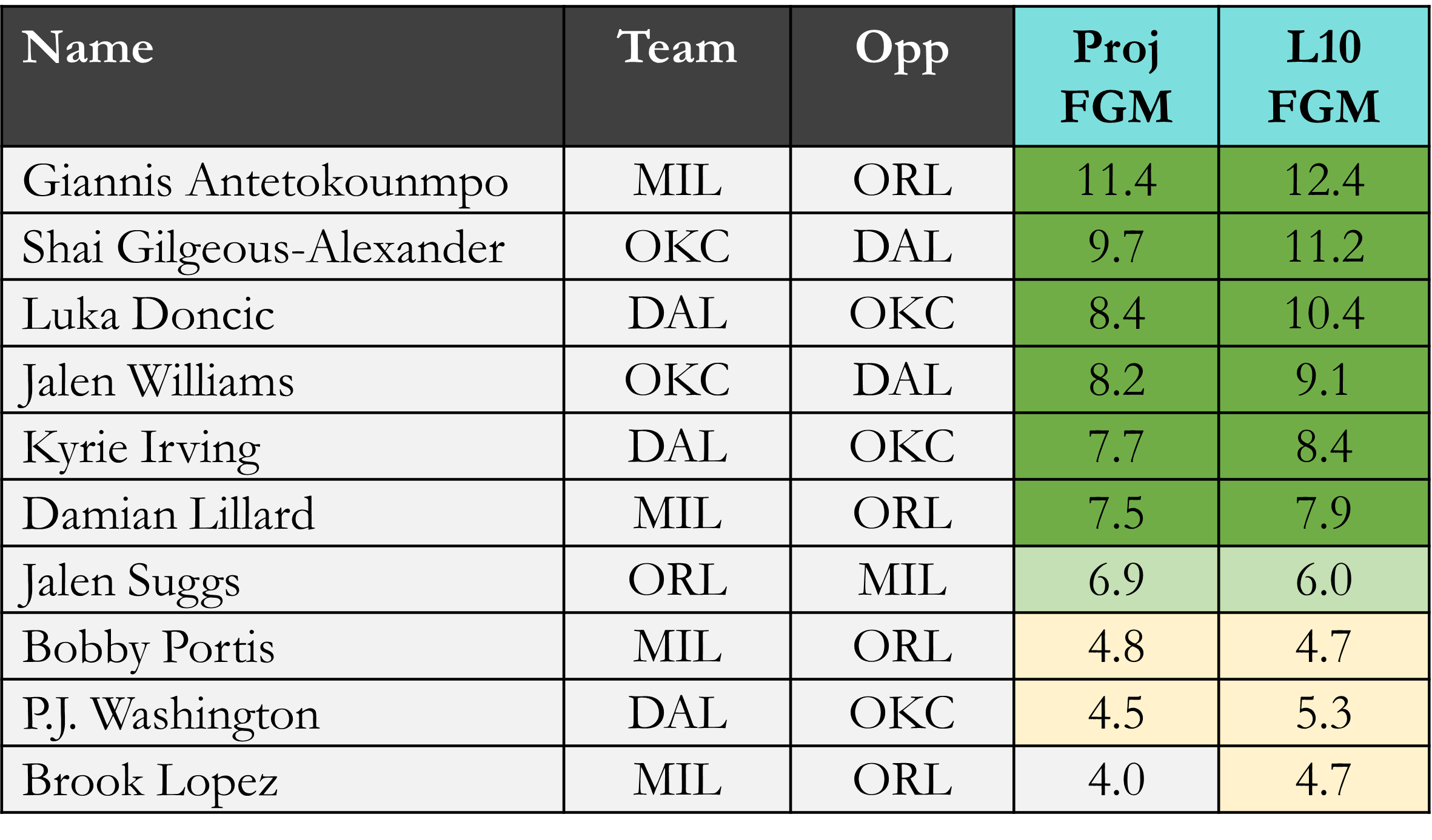 Top players in projected field goals made according to Rotowire & NBA.com, which is available in the table(s) below. Overall rank is based on daily projections, last 10 games, and rest of season projections, which is stack ranked amongst peers for each objective. When there is a single objective, the three data points are still used to stack rank the players vs. ranking solely on projections. For tome+ subscribers, projected rest-of-season stats are available in the provided data file. Omission of certain players would be based on injuries at the time of data pull.