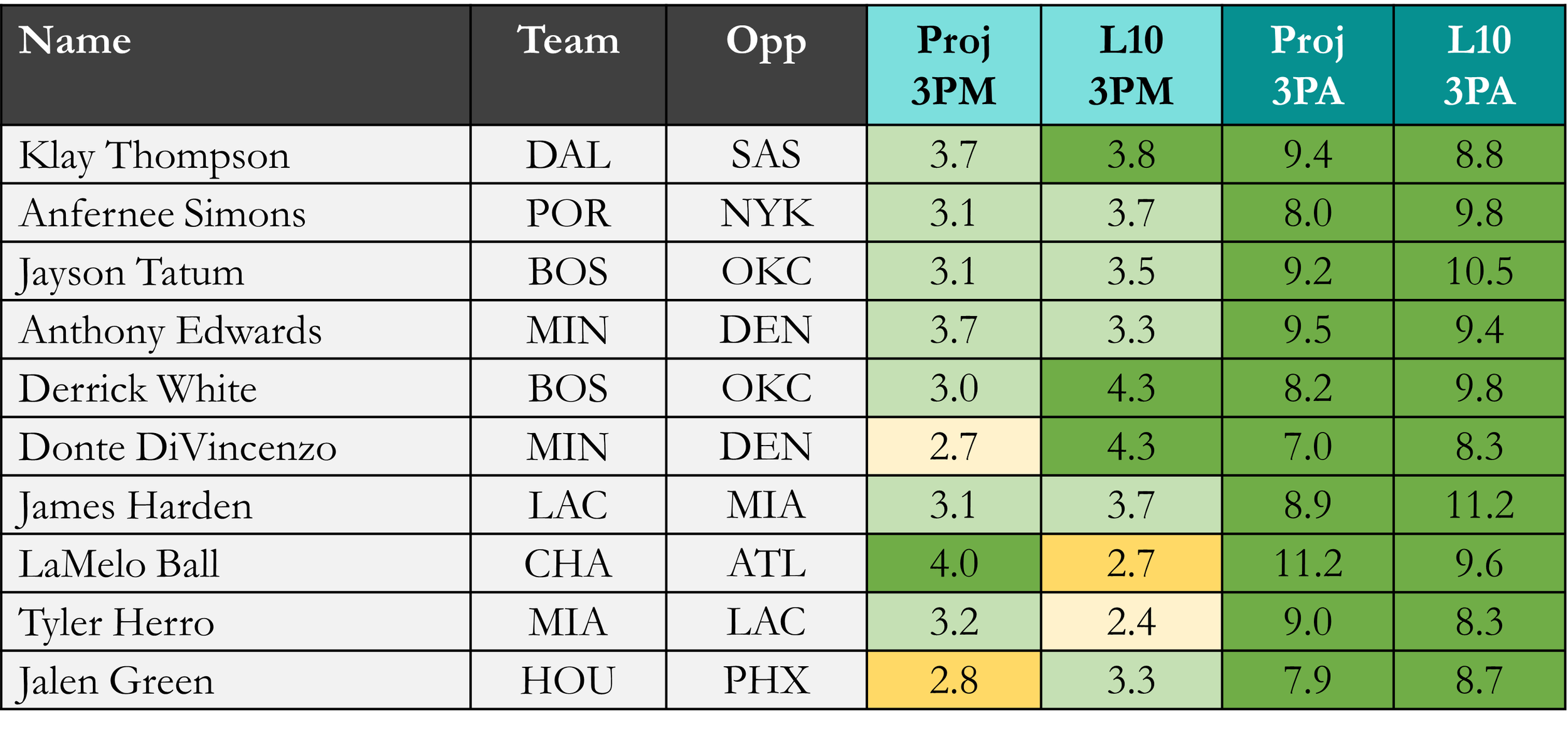 Top players in projected three pointers made & three point attempts according to Rotowire & NBA.com, which is available in the table(s) below. Overall rank is based on daily projections, last 10 games, and rest of season projections, which is stack ranked amongst peers for each objective. When there is a single objective, the three data points are still used to stack rank the players vs. ranking solely on projections. For tome+ subscribers, projected rest-of-season stats are available in the provided data file. Omission of certain players would be based on injuries at the time of data pull.