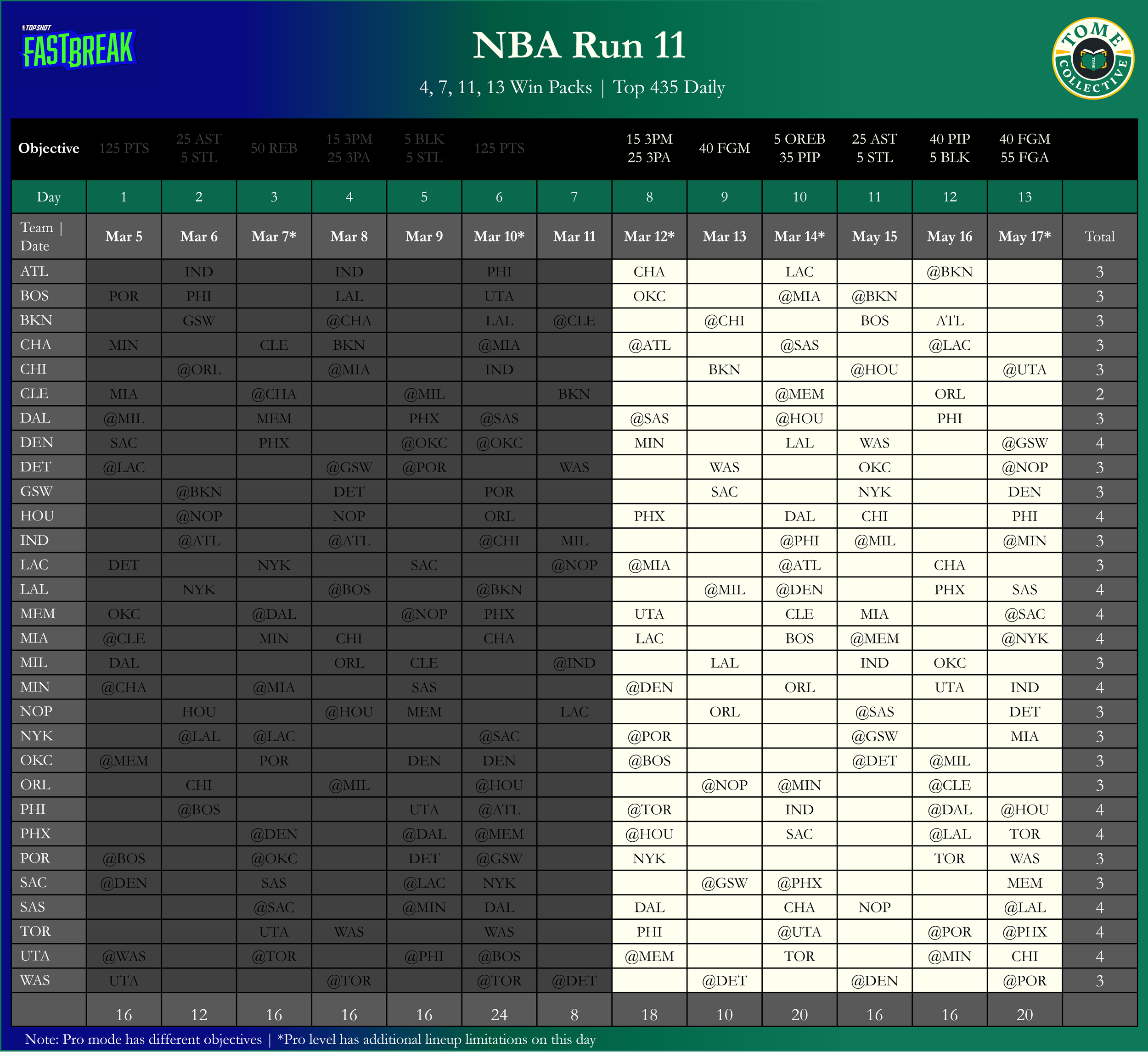 4, 7, & 11 wins: One (1) Fast Break Pack (per tier)