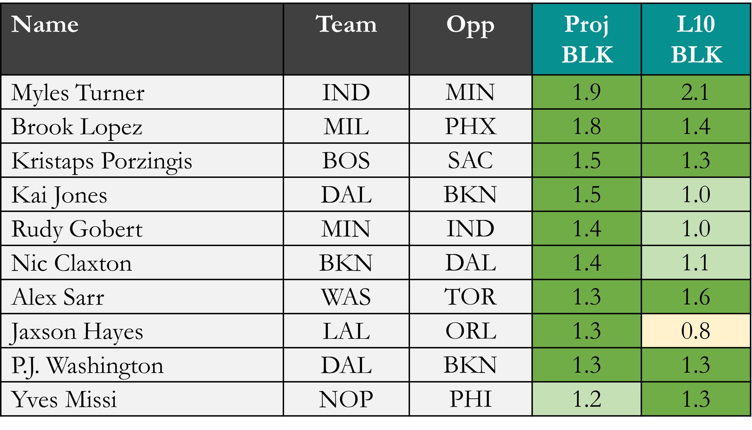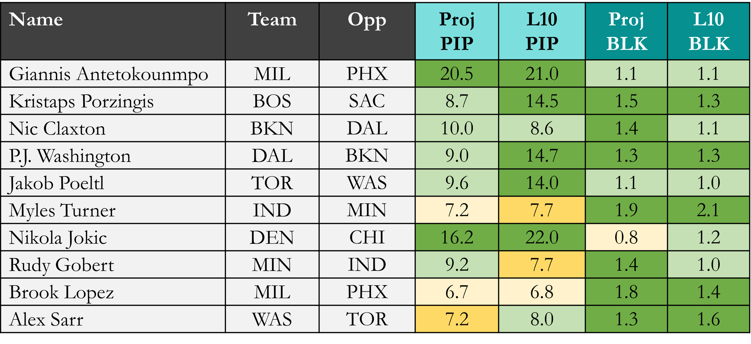 Fast Break Day 7 requires five (5) players who will score 40.0 or more points in the paint and gather 5.0 or more blocks, which means your lineup will need to average 8.0 PIP & 1.0 BLK per player. There are only a handful of players in action today who are both projected and have achieved the minimum threshold for both stats over their last 10 games. If he plays, Giannis is a must-start if he’s still available in your collection considering his high volume of points in the paint and capability to deliver blocks. Porzingis & Washington are also solid plays considering their projections & last 10 games. Alternatively and should you opt for a moneyball approach where you prioritize a person’s proficiencies, there are a plethora of players who can get you points in the paint and others who are block specialists. Let’s dive into the stats for today.