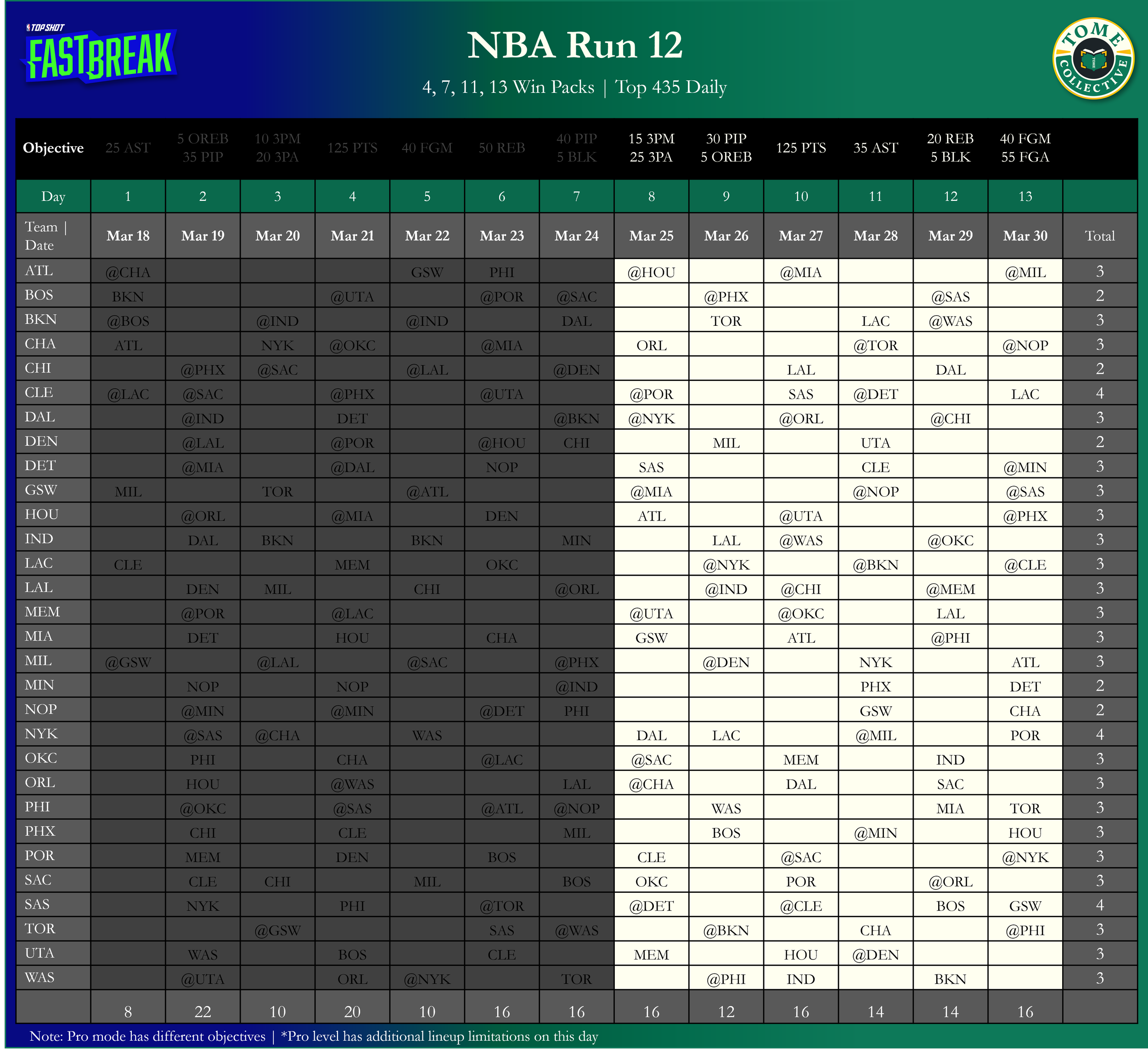 Tomorrow: 30 PIP & 5 OREB will be the two objectives; 12 teams in action