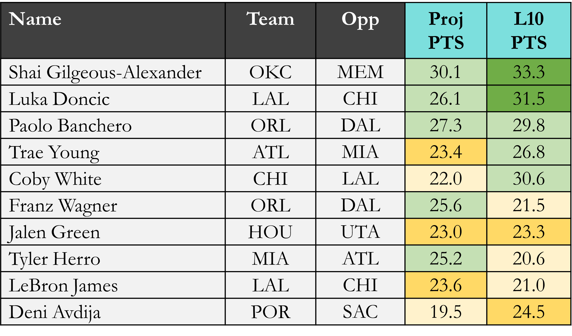 Top players in projected points scored according to Rotowire & NBA.com, which is available in the table(s) below. Overall rank is based on daily projections, last 10 games, and rest of season projections, which is stack ranked amongst peers for each objective. When there is a single objective, the three data points are still used to stack rank the players vs. ranking solely on projections. For tome+ subscribers, projected rest-of-season stats are available in the provided data file. Omission of certain players would be based on injuries at the time of data pull.