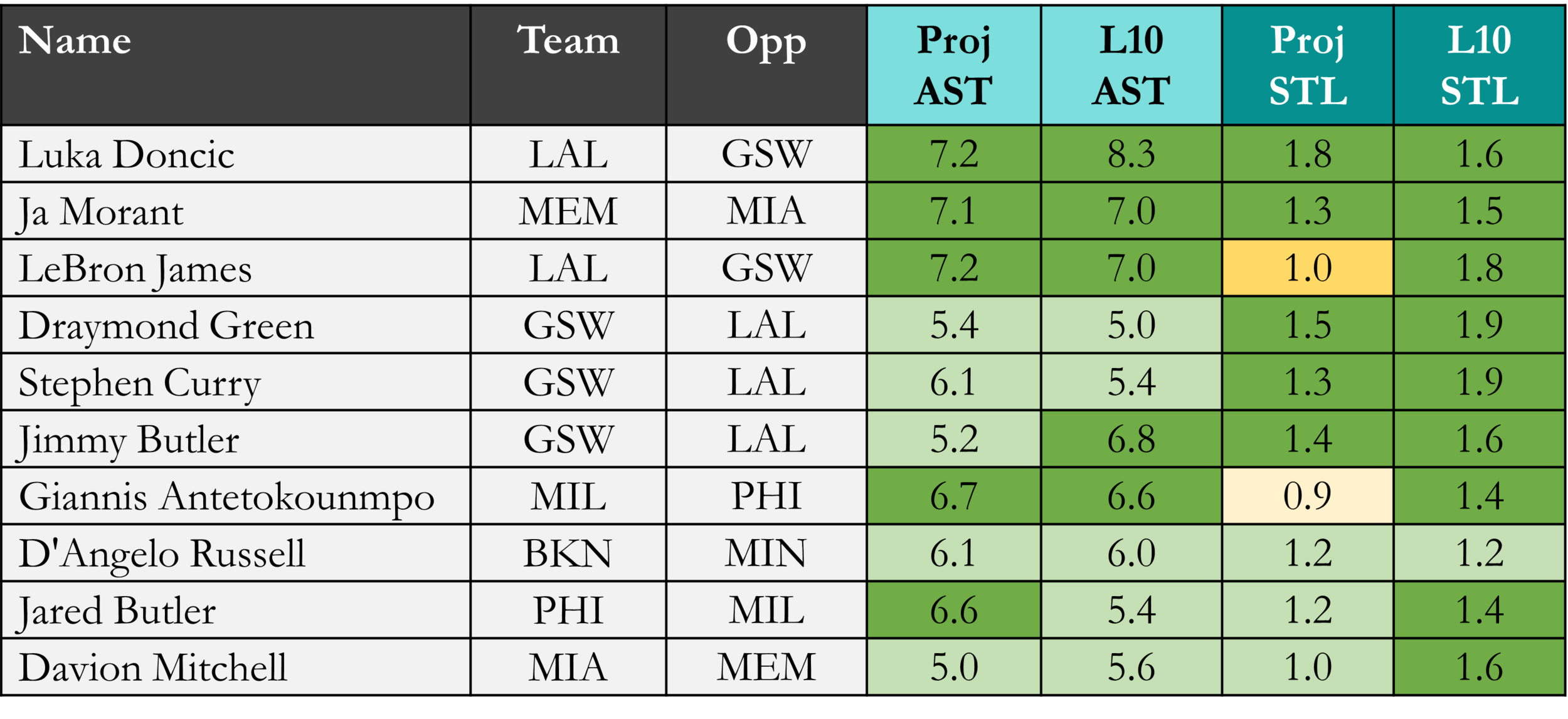 Top players in projected assists & steals according to Rotowire & NBA.com, which is available in the table(s) below. Overall rank is based on daily projections, last 10 games, and rest of season projections, which is stack ranked amongst peers for each objective. When there is a single objective, the three data points are still used to stack rank the players vs. ranking solely on projections. For tome+ subscribers, projected rest-of-season stats are available in the provided data file. Omission of certain players would be based on injuries at the time of data pull.