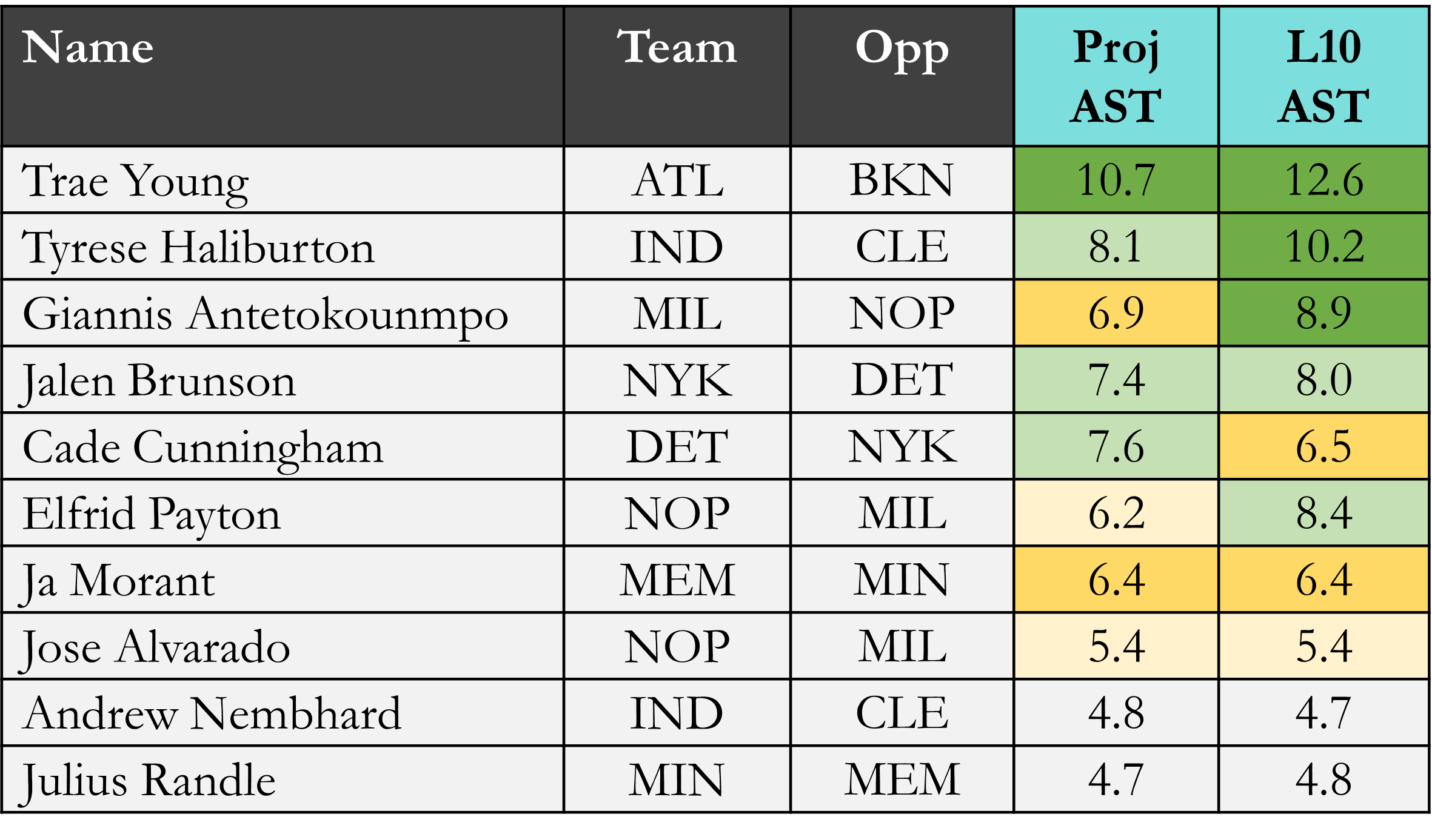 Top players in projected assists according to Rotowire & NBA.com, which is available in the table(s) below. Overall rank is based on daily projections, last 10 games, and rest of season projections, which is stack ranked amongst peers for each objective. When there is a single objective, the three data points are still used to stack rank the players vs. ranking solely on projections. For tome+ subscribers, projected rest-of-season stats are available in the provided data file. Omission of certain players would be based on injuries at the time of data pull.