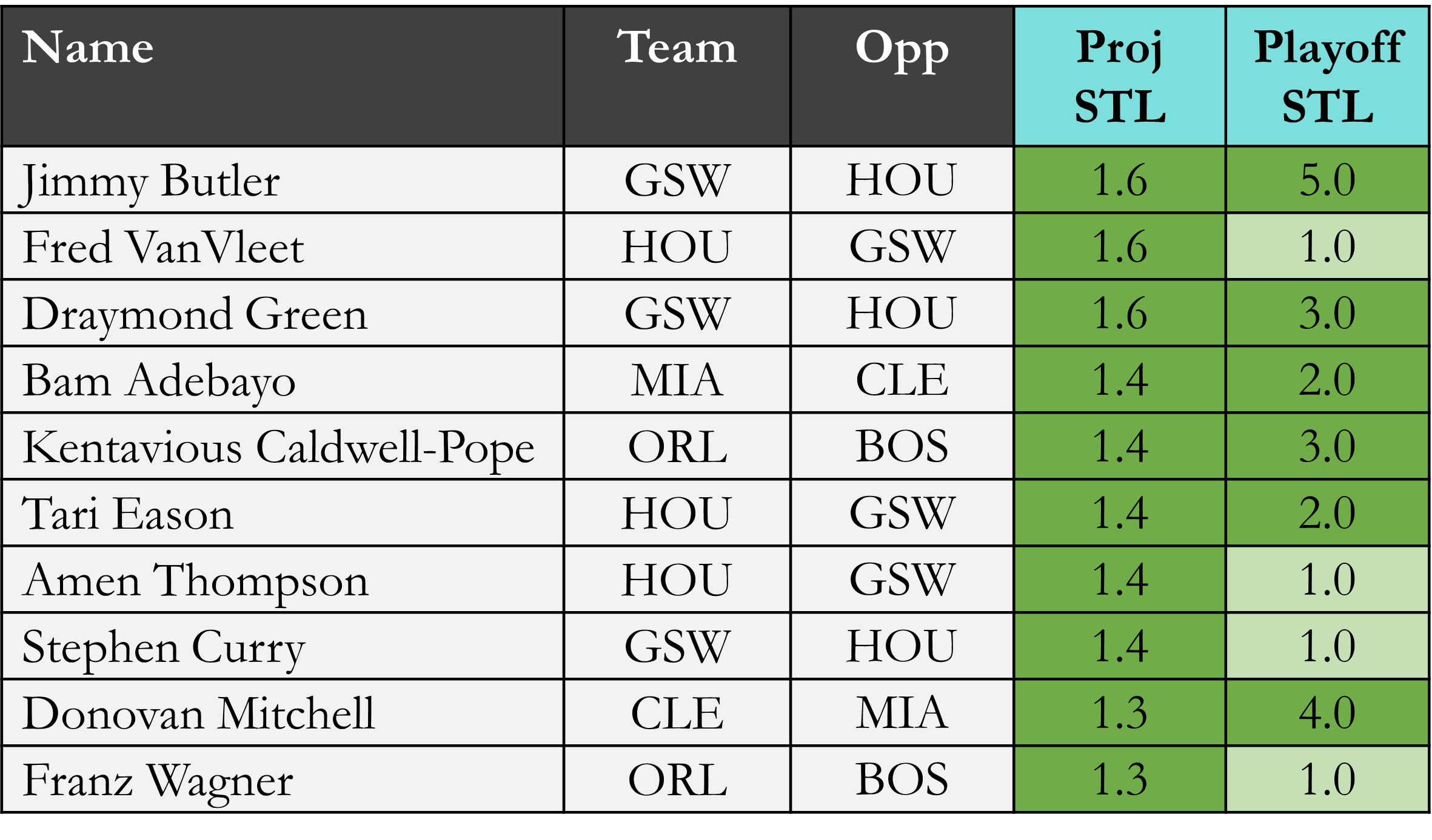 Fast Break Day 5 requires five (5) players who will accumulate 5.0 or more steals and score 100.0 or more points, which means each player will need to average at least 1.0 STL & 20.0 PTS per player. These two objectives are infrequently correlated, but there are a handful of players who have a tendency to deliver both. Jimmy Butler’s 5 steals in Game 1 may be an outlier, but his scoring output could be the worth the inclusion in your lineup. Although 100 points is lower than the normal threshold of 125, there is still a risk in missing the mark if you have a gross underperformer (like Jalen Green in Game 1). Also, steals are never a given, so you could be tripped up there as well (and no Dyson Daniels in sight). Whether you lean entirely on the players who can deliver both objectives or moneyball it to identify specialists, today will likely have a much lower success rate than we’ve seen to date.