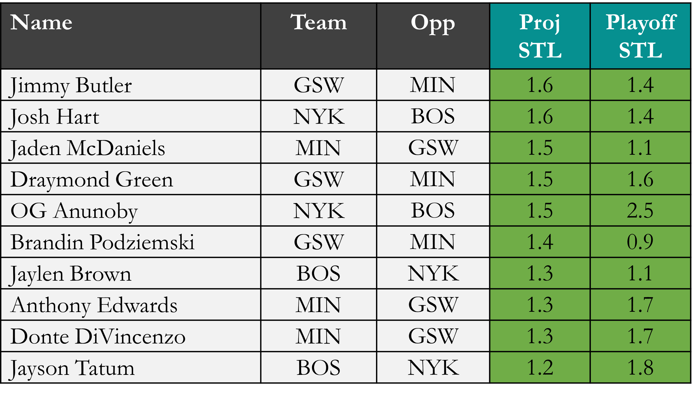 Top players in projected Points Scored & Steals according to Rotowire & NBA.com, which is available in the table(s) below. Overall rank is based on daily projections, playoff average, and rest of playoffs projections, which is stack ranked amongst peers for each objective. When there is a single objective, the three data points are still used to stack rank the players vs. ranking solely on projections. For tome+ subscribers, projected rest-of-playoffs stats are available in the provided data file. Omission of certain players would be based on injuries at the time of data pull.