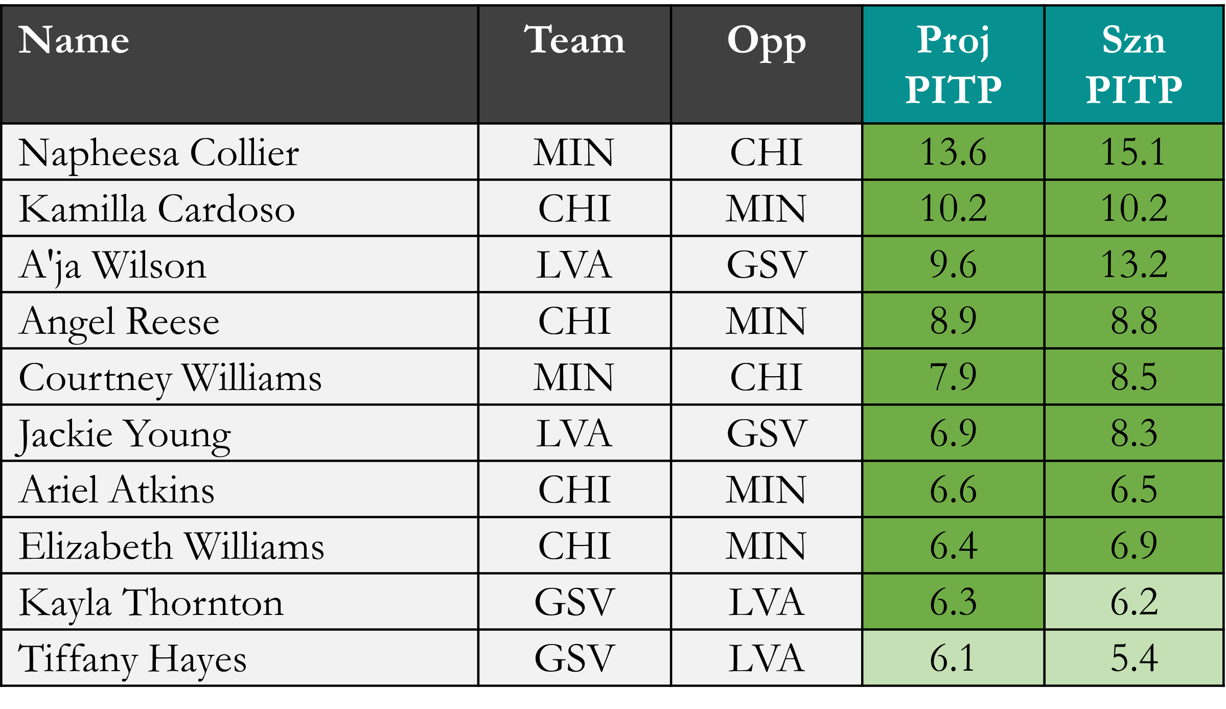 Top players in projected rebounds & points in the paint according to Rotowire & WNBA.com, which is available in the table(s) below. Overall rank is based on daily projections and season averages, which is stack ranked amongst peers for each objective. When there is a single objective, the three data points are still used to stack rank the players vs. ranking solely on projections. For tome+ members, all active player stats are available in the provided data file. Omission of certain players would be based on injuries at the time of data pull.