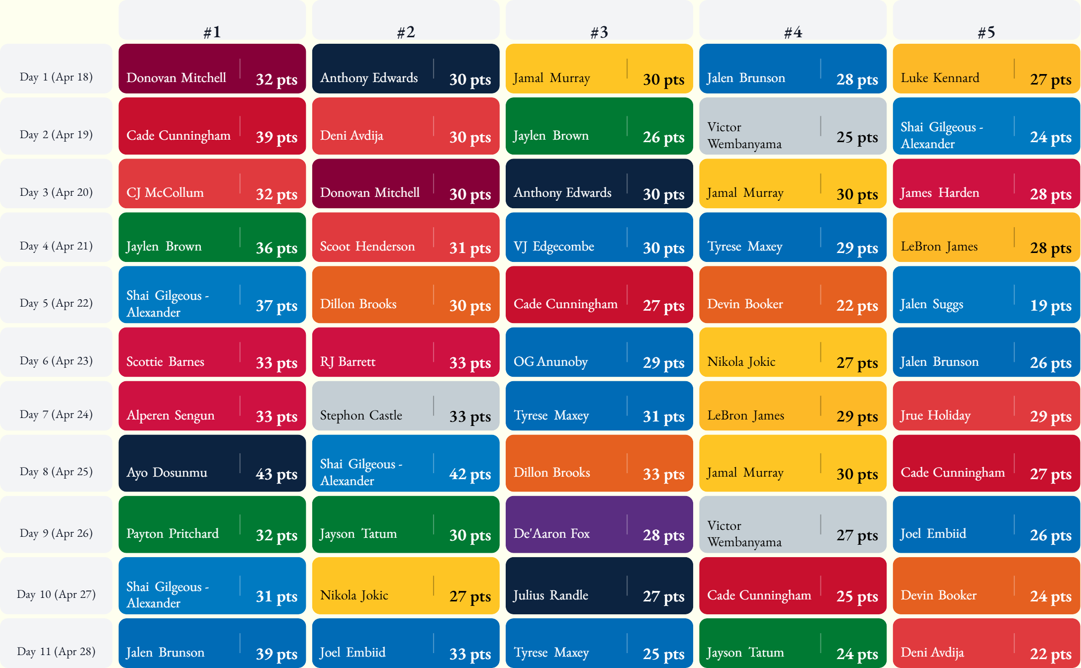 Top Five Scorers (by day):