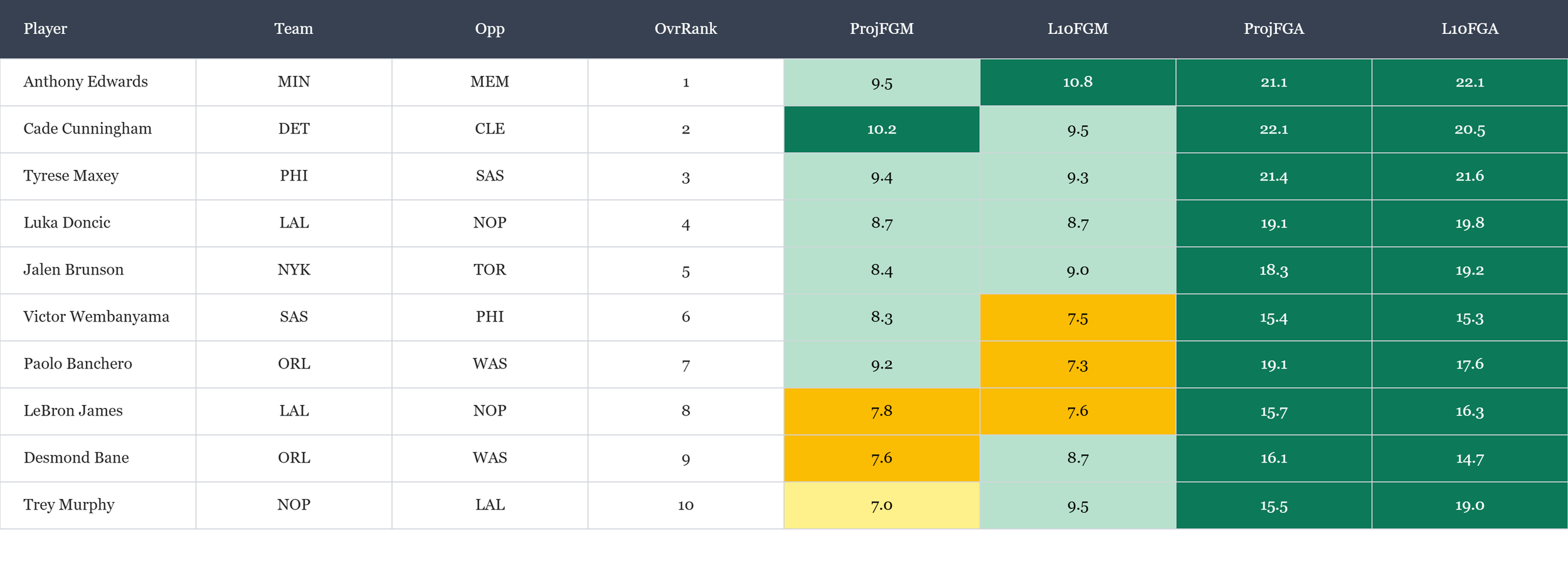 Today's objective pairs 40 field goals made with 50 field goal attempts — breaking down to 8.0 FGM and 10.0 FGA per player. The FGA floor is the real driver here; you need active scorers putting up double-digit shot attempts, not efficient role players sneaking through on four or five tries. The made-field-goal threshold will take care of itself if you're targeting volume. At this stage of the run, you're likely scraping the bottom of the barrel, but a captain logging 12+ attempts gives you enough runway to cover both thresholds in a single slot.