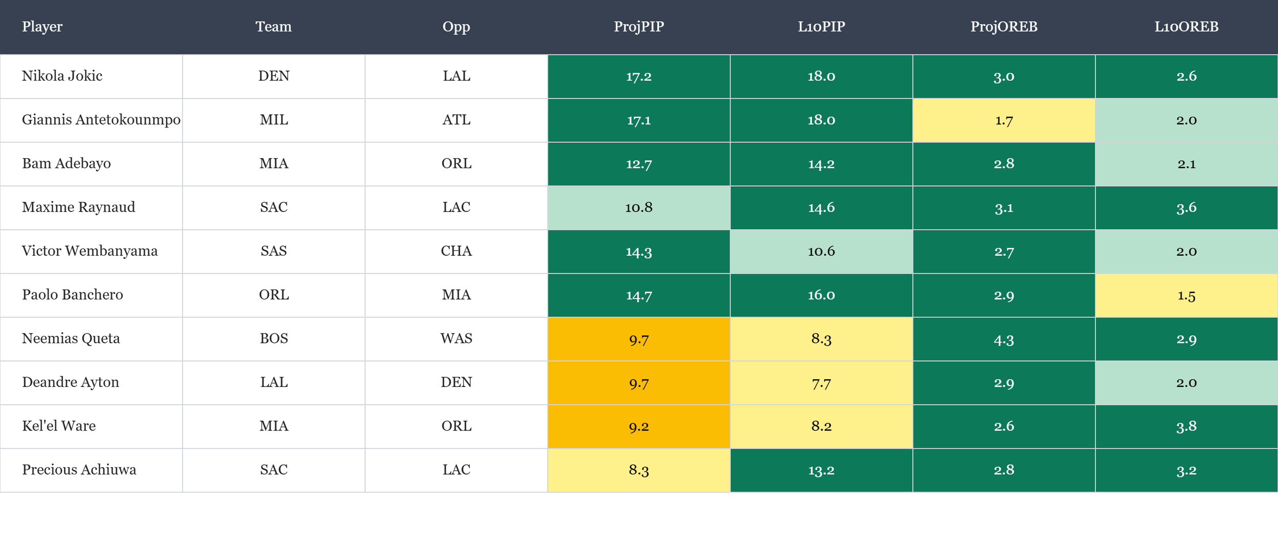 Top players in points in the paint & offensive rebounds according to Rotowire & NBA.com, which is available in the table(s) below. Overall rank is based on daily projections and season averages, which is stack ranked amongst peers for each objective. When there is a single objective, the three data points are still used to stack rank the players vs. ranking solely on projections. For tome+ members, all active player stats are available in the provided data file. Omission of certain players would be based on injuries at the time of data pull.