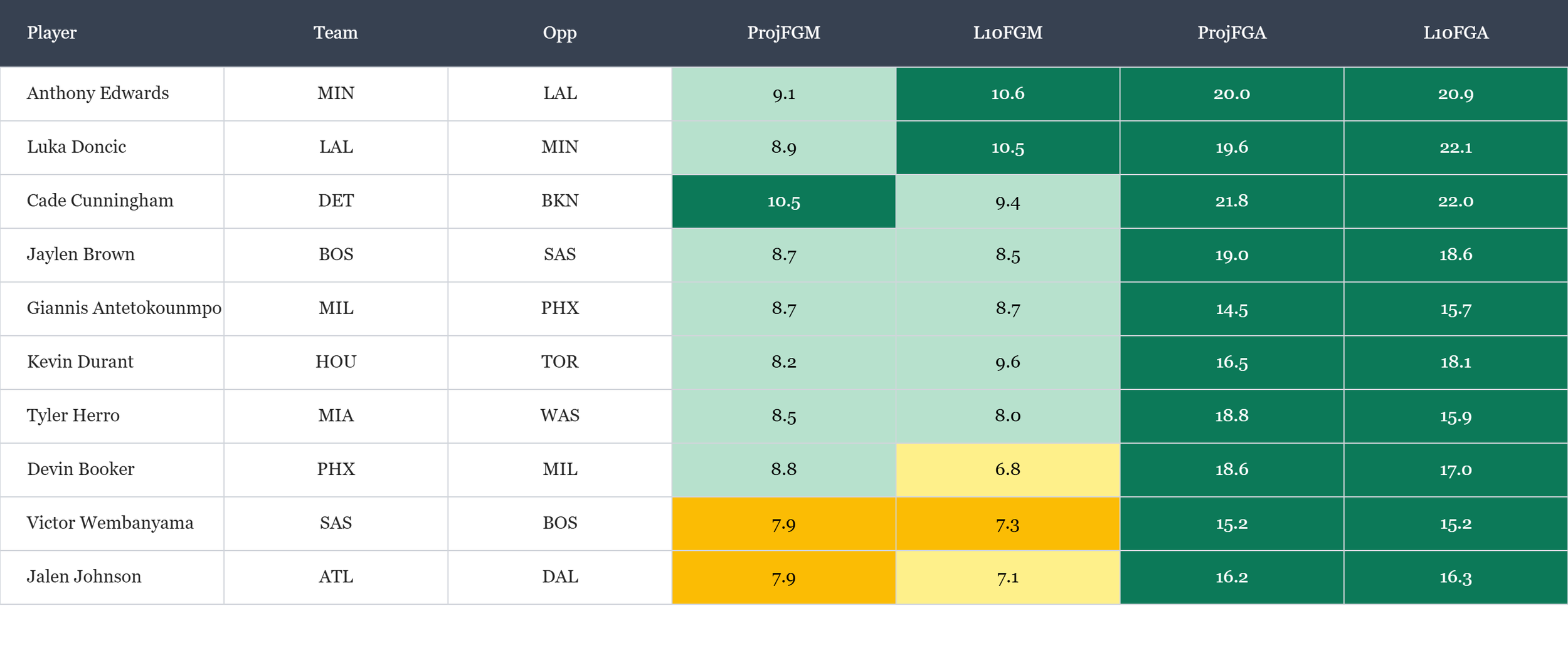 Top players in field goals made & field goal attempts according to Rotowire & NBA.com, which is available in the table(s) below. Overall rank is based on daily projections and season averages, which is stack ranked amongst peers for each objective. When there is a single objective, the three data points are still used to stack rank the players vs. ranking solely on projections. For tome+ members, all active player stats are available in the provided data file. Omission of certain players would be based on injuries at the time of data pull.