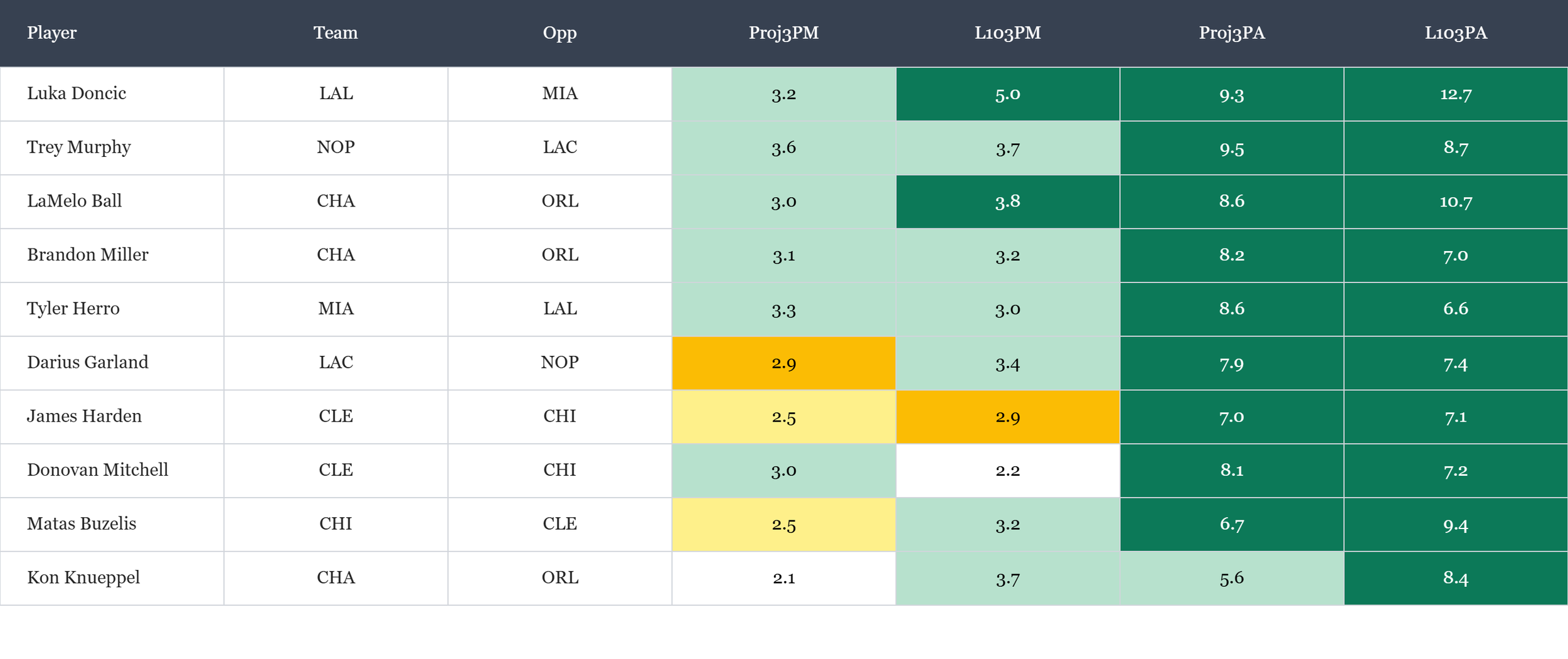 Top players in three pointers made & three point attempts according to Rotowire & NBA.com, which is available in the table(s) below. Overall rank is based on daily projections and season averages, which is stack ranked amongst peers for each objective. When there is a single objective, the three data points are still used to stack rank the players vs. ranking solely on projections. For tome+ members, all active player stats are available in the provided data file. Omission of certain players would be based on injuries at the time of data pull.