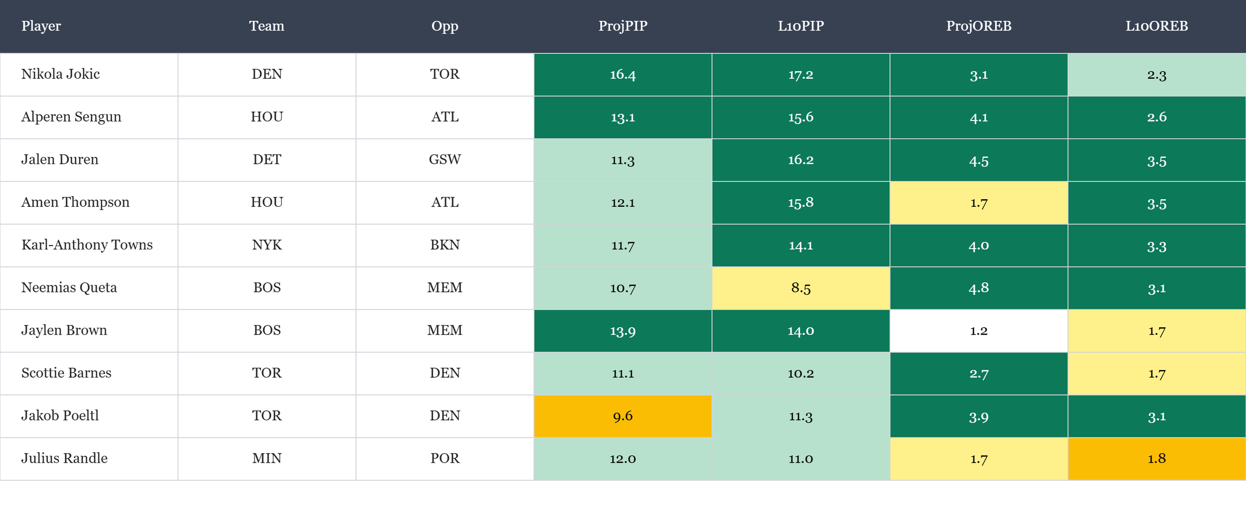 Top players in points in the paint & offensive rebounds according to Rotowire & NBA.com, which is available in the table(s) below. Overall rank is based on daily projections and season averages, which is stack ranked amongst peers for each objective. When there is a single objective, the three data points are still used to stack rank the players vs. ranking solely on projections. For tome+ members, all active player stats are available in the provided data file. Omission of certain players would be based on injuries at the time of data pull.