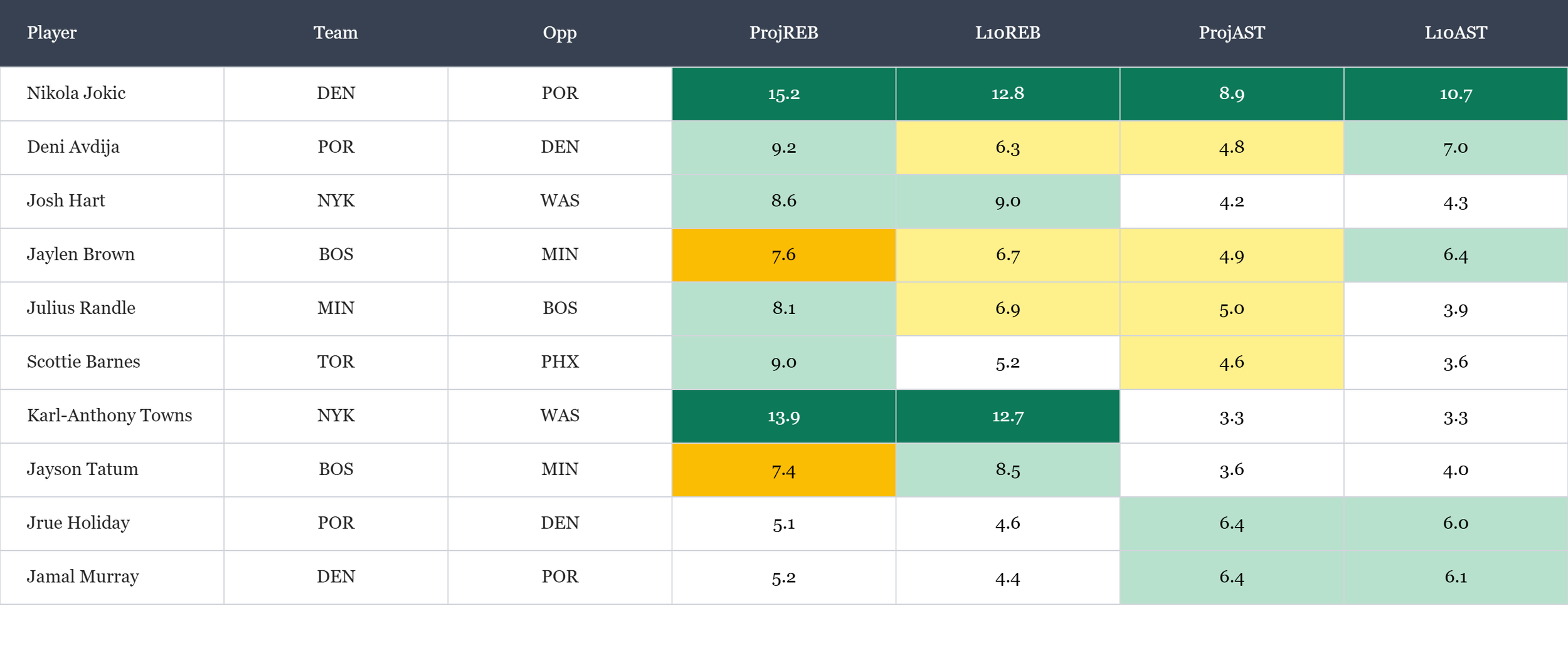 Top players in rebounds & assists according to Rotowire & NBA.com, which is available in the table(s) below. Overall rank is based on daily projections and season averages, which is stack ranked amongst peers for each objective. When there is a single objective, the three data points are still used to stack rank the players vs. ranking solely on projections. For tome+ members, all active player stats are available in the provided data file. Omission of certain players would be based on injuries at the time of data pull.