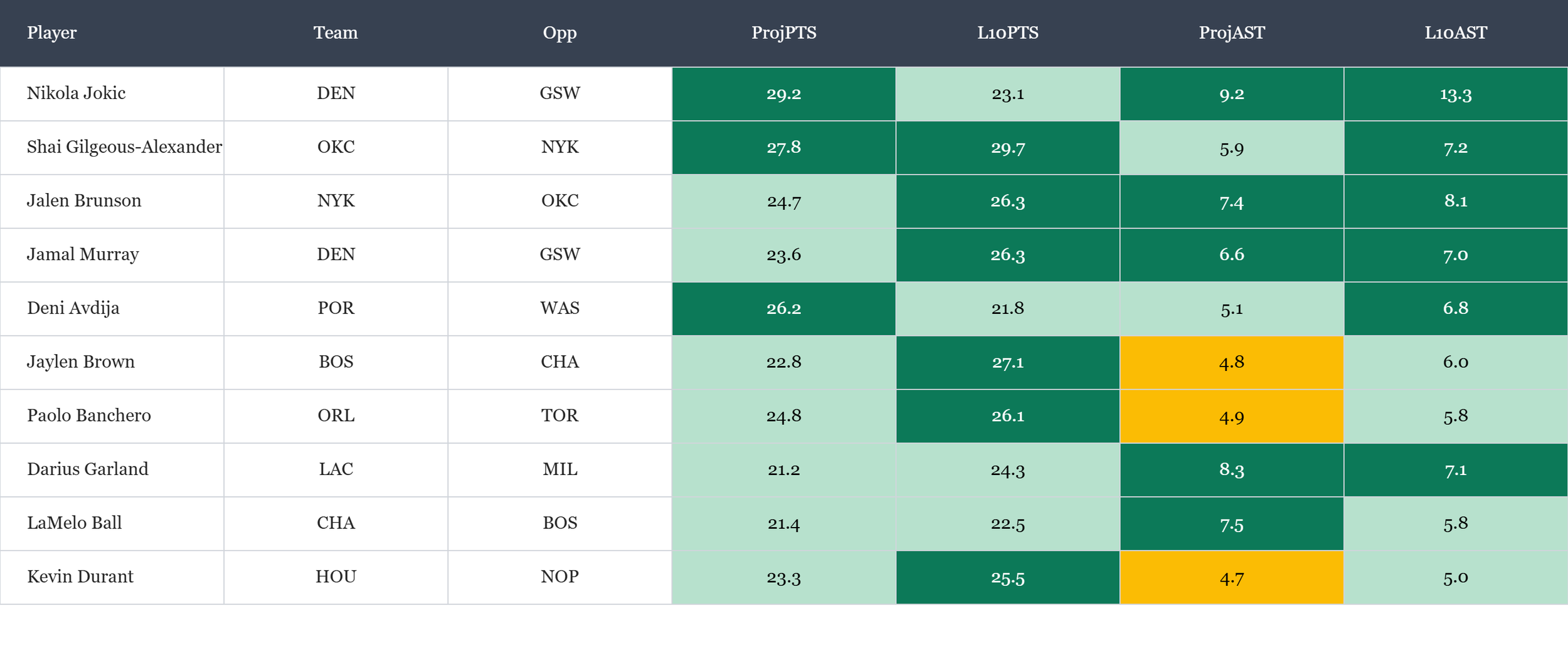 Top players in points scored & assists according to Rotowire & NBA.com, which is available in the table(s) below. Overall rank is based on daily projections and season averages, which is stack ranked amongst peers for each objective. When there is a single objective, the three data points are still used to stack rank the players vs. ranking solely on projections. For tome+ members, all active player stats are available in the provided data file. Omission of certain players would be based on injuries at the time of data pull.