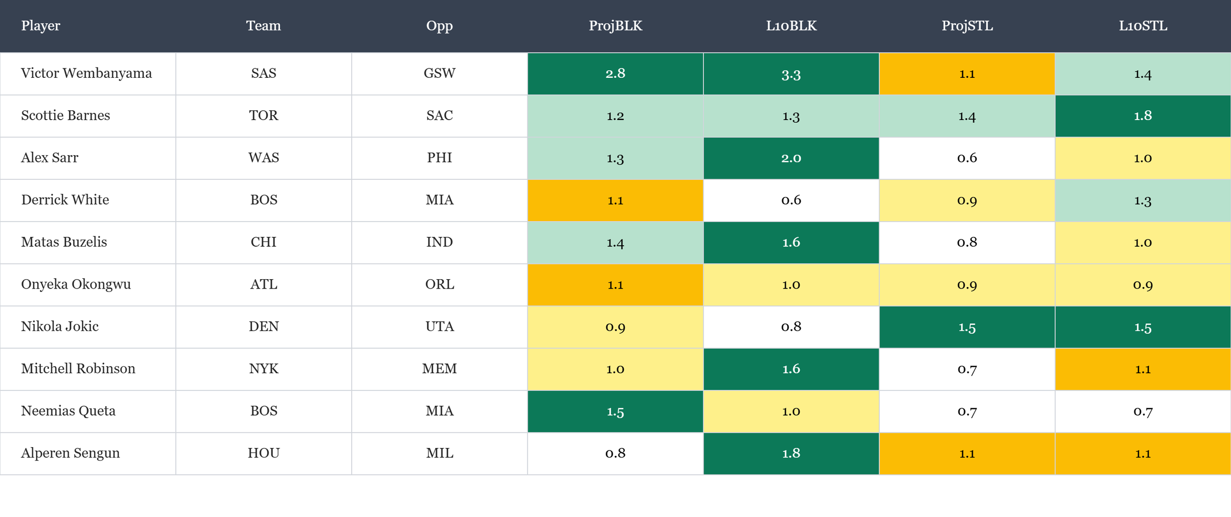 Top players in blocks & steals according to Rotowire & NBA.com, which is available in the table(s) below. Overall rank is based on daily projections and season averages, which is stack ranked amongst peers for each objective. When there is a single objective, the three data points are still used to stack rank the players vs. ranking solely on projections. For tome+ members, all active player stats are available in the provided data file. Omission of certain players would be based on injuries at the time of data pull.