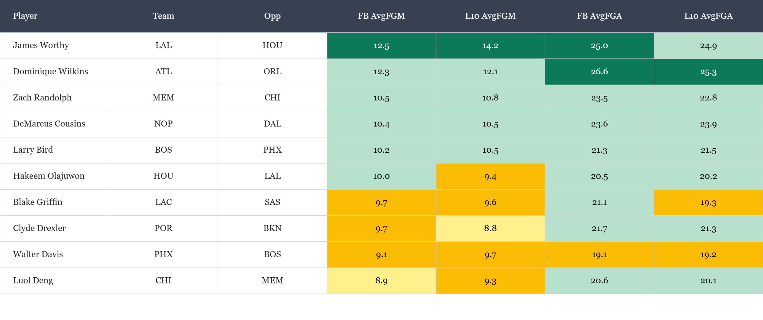 Top players in field goals made & field goal attempts according to Rotowire & nbatopshot.com, which is available in the table(s) below. Overall rank is based on average results (across multiple historic runs), which is stack ranked amongst peers for each objective. When there is a single objective, the data points are still used to stack rank the players. For tome+ members, all active player stats are available in the provided data file.