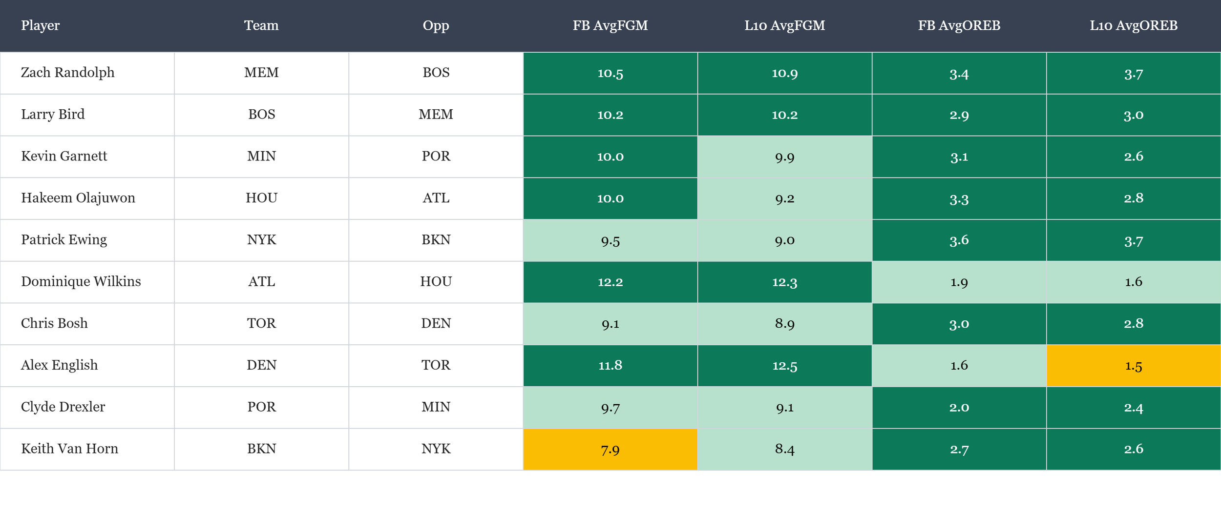 Top players in field goals made & offensive rebounds according to Rotowire & nbatopshot.com, which is available in the table(s) below. Overall rank is based on average results (across multiple historic runs), which is stack ranked amongst peers for each objective. When there is a single objective, the data points are still used to stack rank the players. For tome+ members, all active player stats are available in the provided data file.