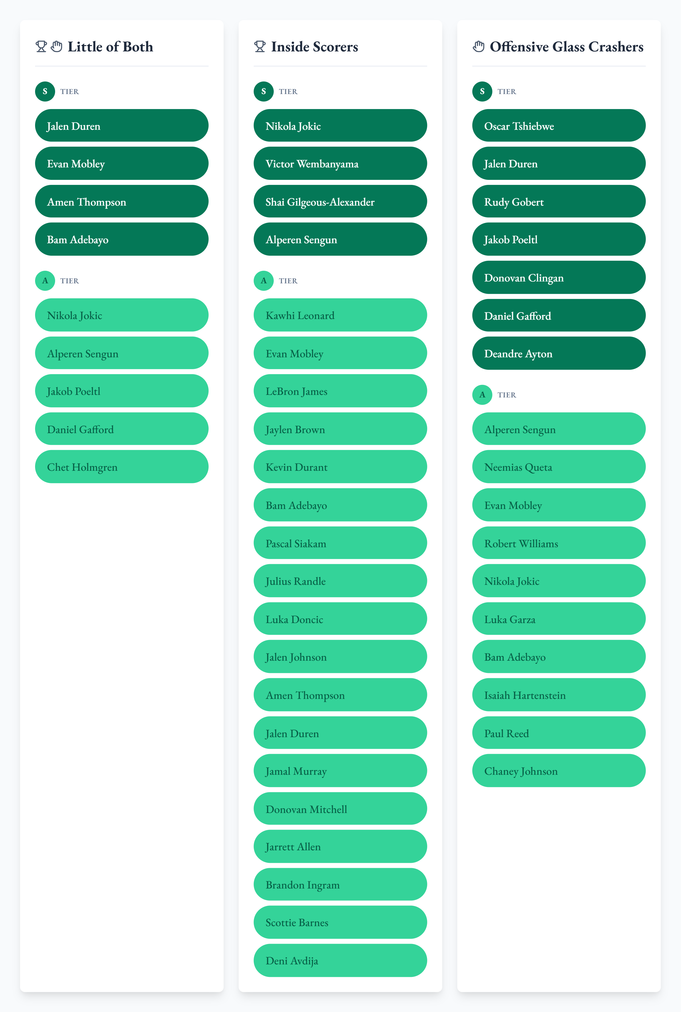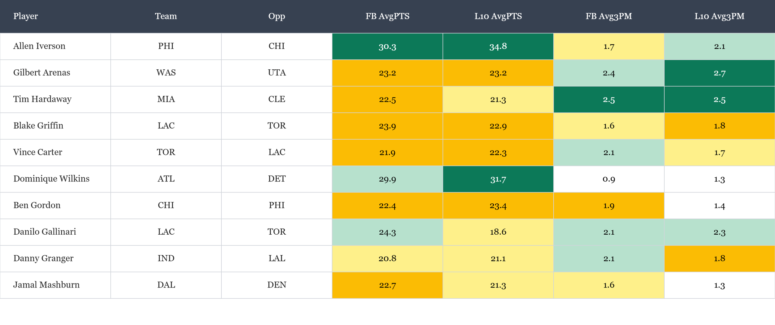 Top players in points scored & three pointers made according to Rotowire & nbatopshot.com, which is available in the table(s) below. Overall rank is based on average results (across multiple historic runs), which is stack ranked amongst peers for each objective. When there is a single objective, the data points are still used to stack rank the players. For tome+ members, all active player stats are available in the provided data file.