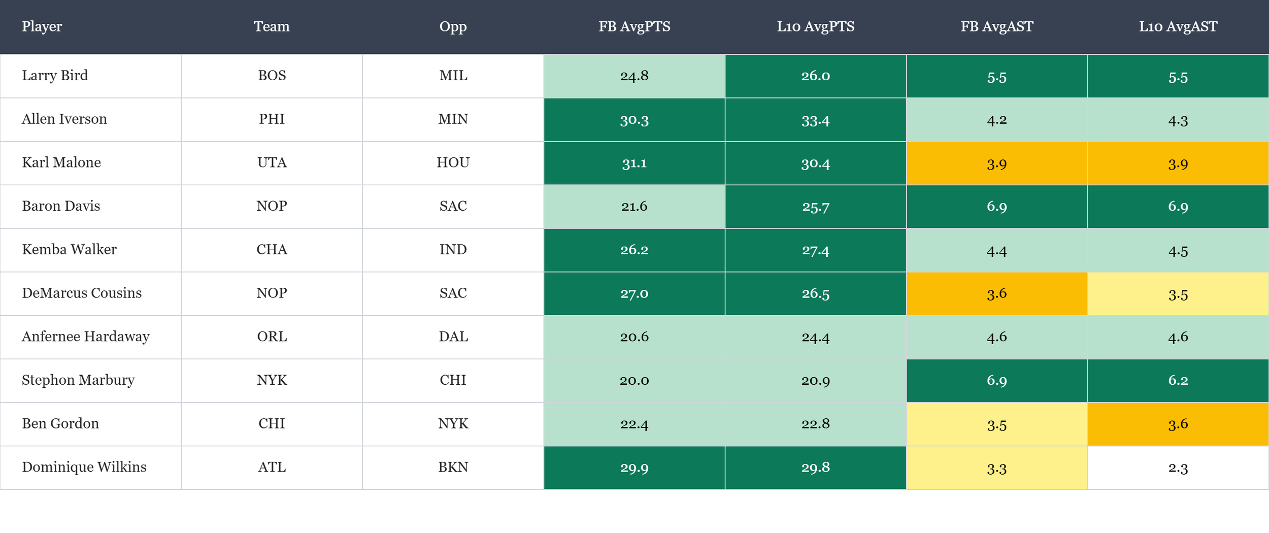 Top players in points scored & assists according to Rotowire & nbatopshot.com, which is available in the table(s) below. Overall rank is based on average results (across multiple historic runs), which is stack ranked amongst peers for each objective. When there is a single objective, the data points are still used to stack rank the players. For tome+ members, all active player stats are available in the provided data file.