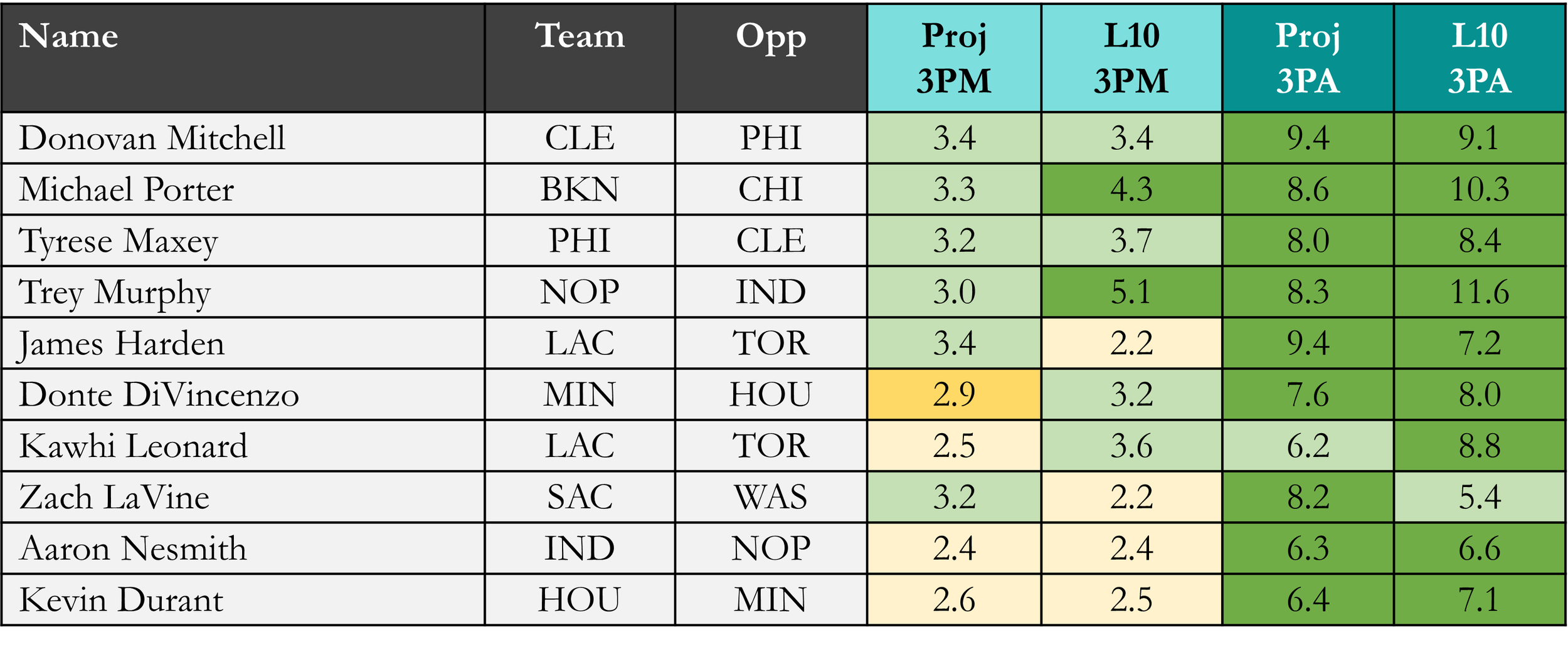 Top players in three pointers made & three point attempts according to Rotowire & NBA.com, which is available in the table(s) below. Overall rank is based on daily projections, last 10 average, and season averages, which is stack ranked amongst peers for each objective. When there is a single objective, the three data points are still used to stack rank the players vs. ranking solely on projections. For tome+ members, all active player stats are available in the provided data file. Omission of certain players would be based on injuries at the time of data pull.