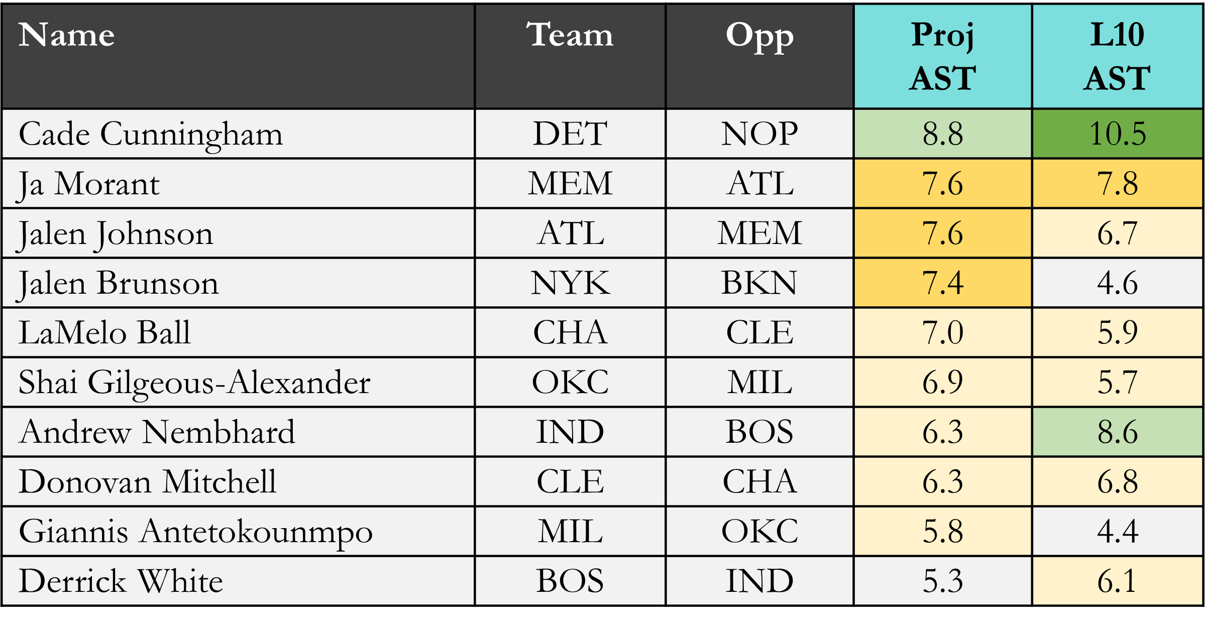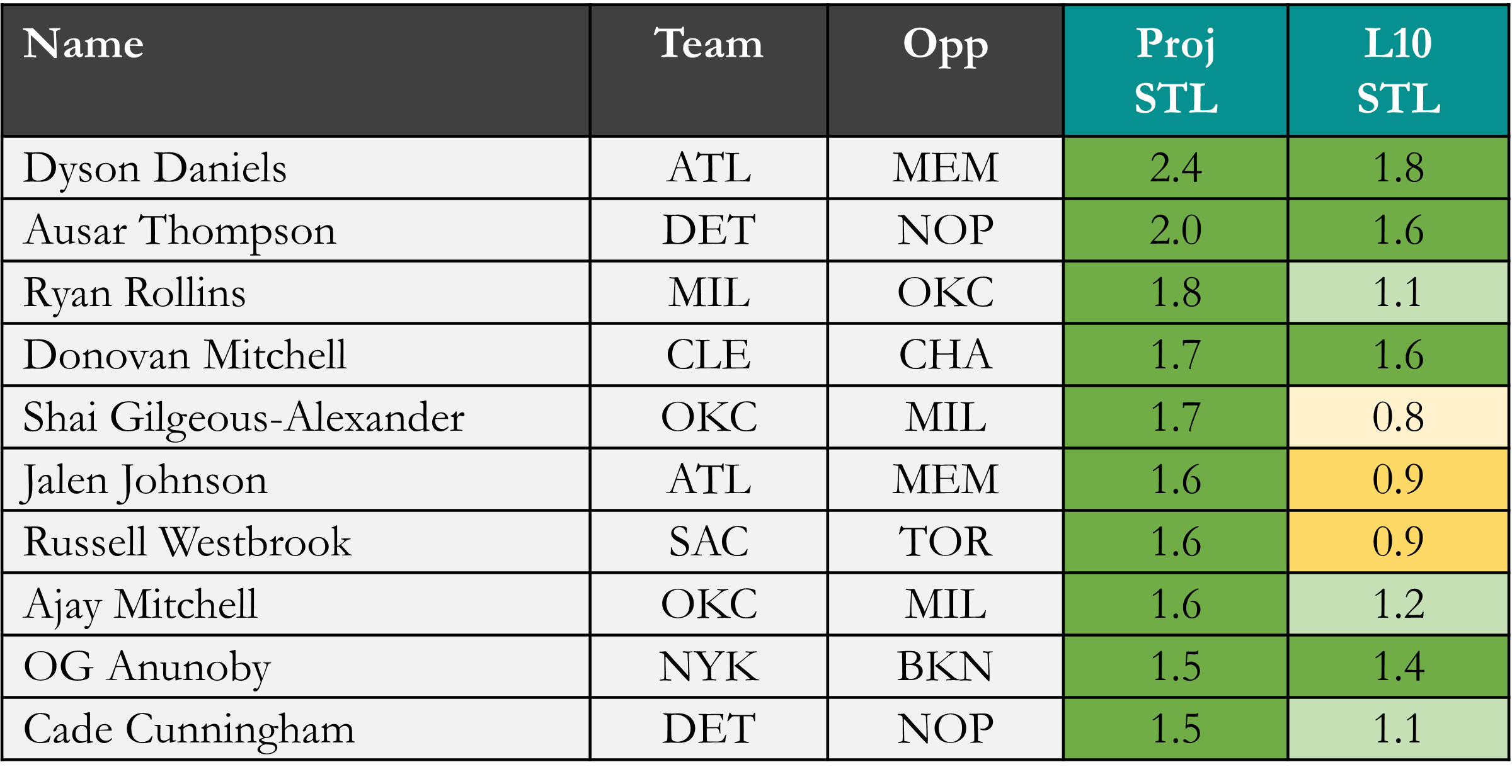 Top players in assists & steals according to Rotowire & NBA.com, which is available in the table(s) below. Overall rank is based on daily projections, last 10 average, and season averages, which is stack ranked amongst peers for each objective. When there is a single objective, the three data points are still used to stack rank the players vs. ranking solely on projections. For tome+ members, all active player stats are available in the provided data file. Omission of certain players would be based on injuries at the time of data pull.