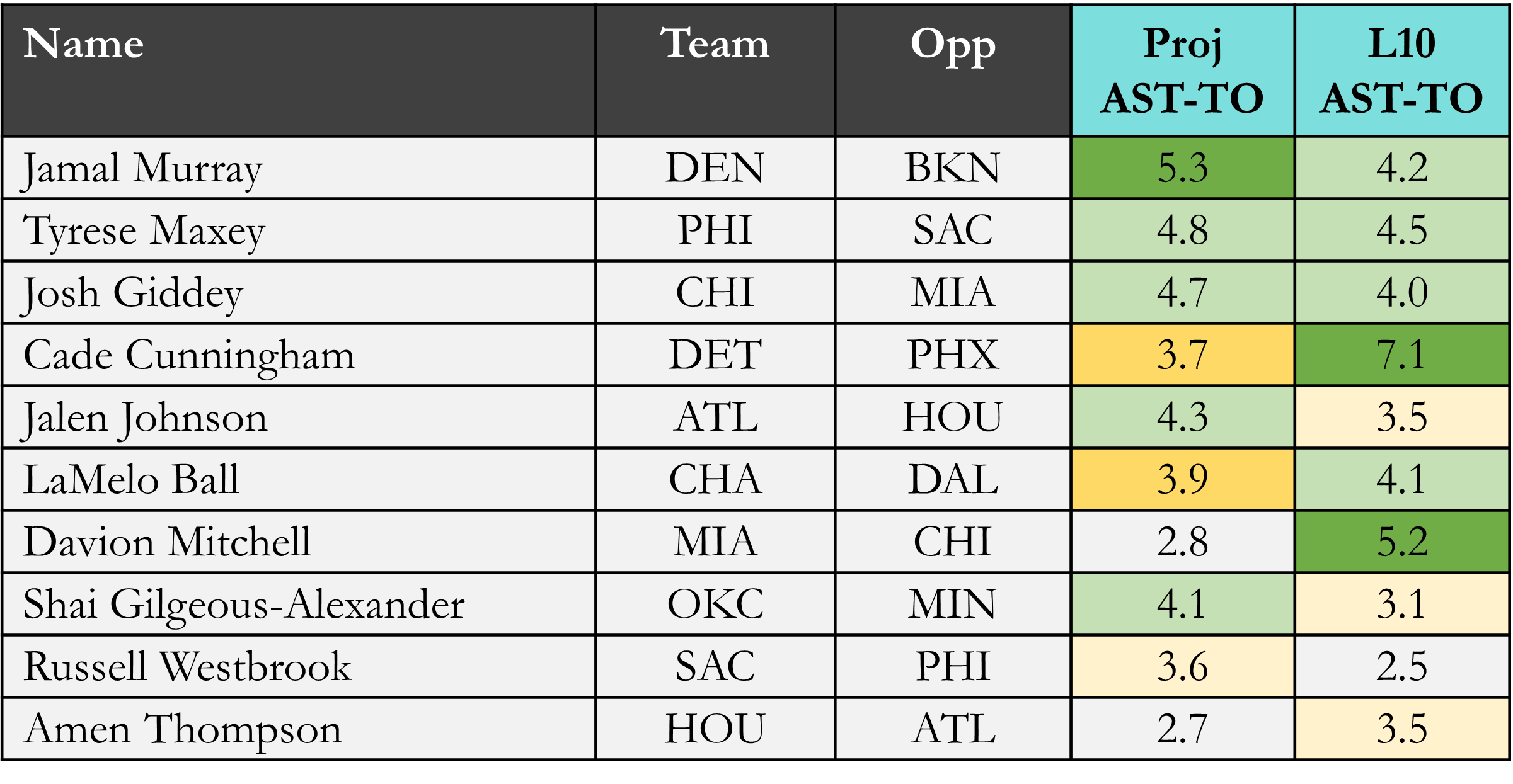 Top players in assists minus turnovers according to Rotowire & NBA.com, which is available in the table(s) below. Overall rank is based on daily projections, last 10 average, and season averages, which is stack ranked amongst peers for each objective. When there is a single objective, the three data points are still used to stack rank the players vs. ranking solely on projections. For tome+ members, all active player stats are available in the provided data file. Omission of certain players would be based on injuries at the time of data pull.
