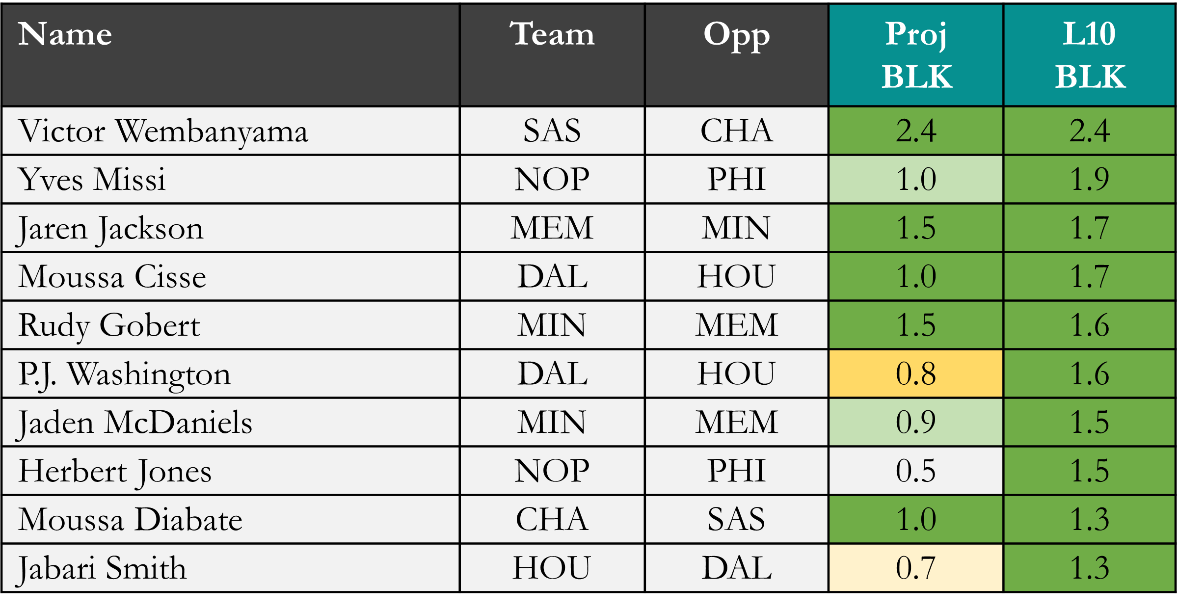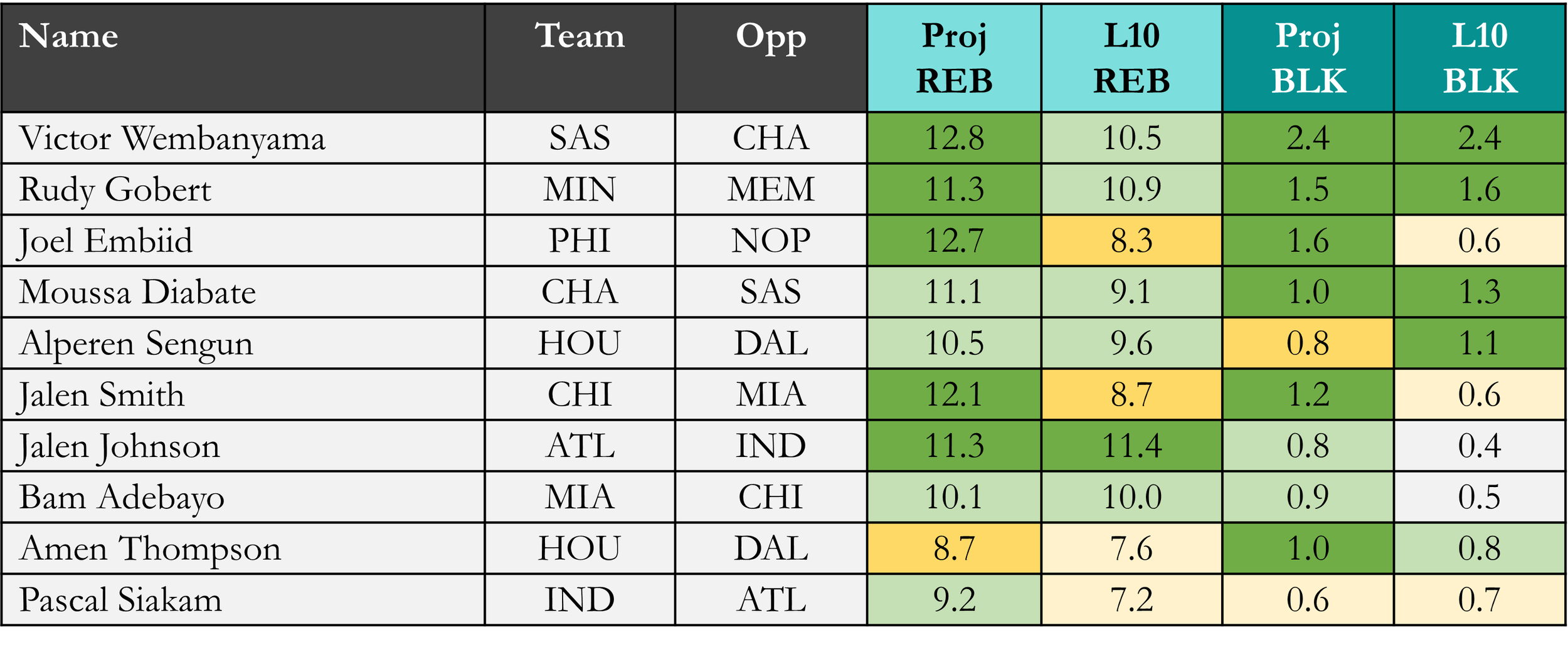 Top players in rebounds & blocks according to Rotowire & NBA.com, which is available in the table(s) below. Overall rank is based on daily projections, last 10 average, and season averages, which is stack ranked amongst peers for each objective. When there is a single objective, the three data points are still used to stack rank the players vs. ranking solely on projections. For tome+ members, all active player stats are available in the provided data file. Omission of certain players would be based on injuries at the time of data pull.