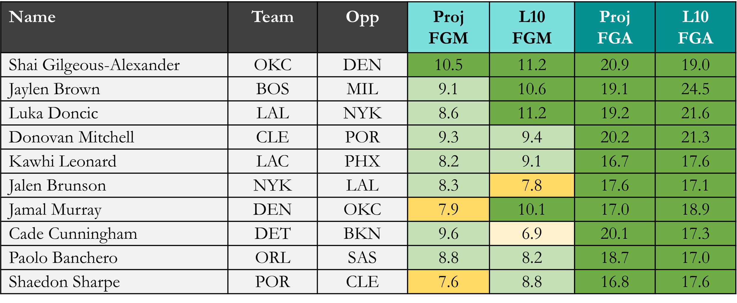 Top players in field goals made & field goal attempts according to Rotowire & NBA.com, which is available in the table(s) below. Overall rank is based on daily projections, last 10 average, and season averages, which is stack ranked amongst peers for each objective. When there is a single objective, the three data points are still used to stack rank the players vs. ranking solely on projections. For tome+ members, all active player stats are available in the provided data file. Omission of certain players would be based on injuries at the time of data pull.