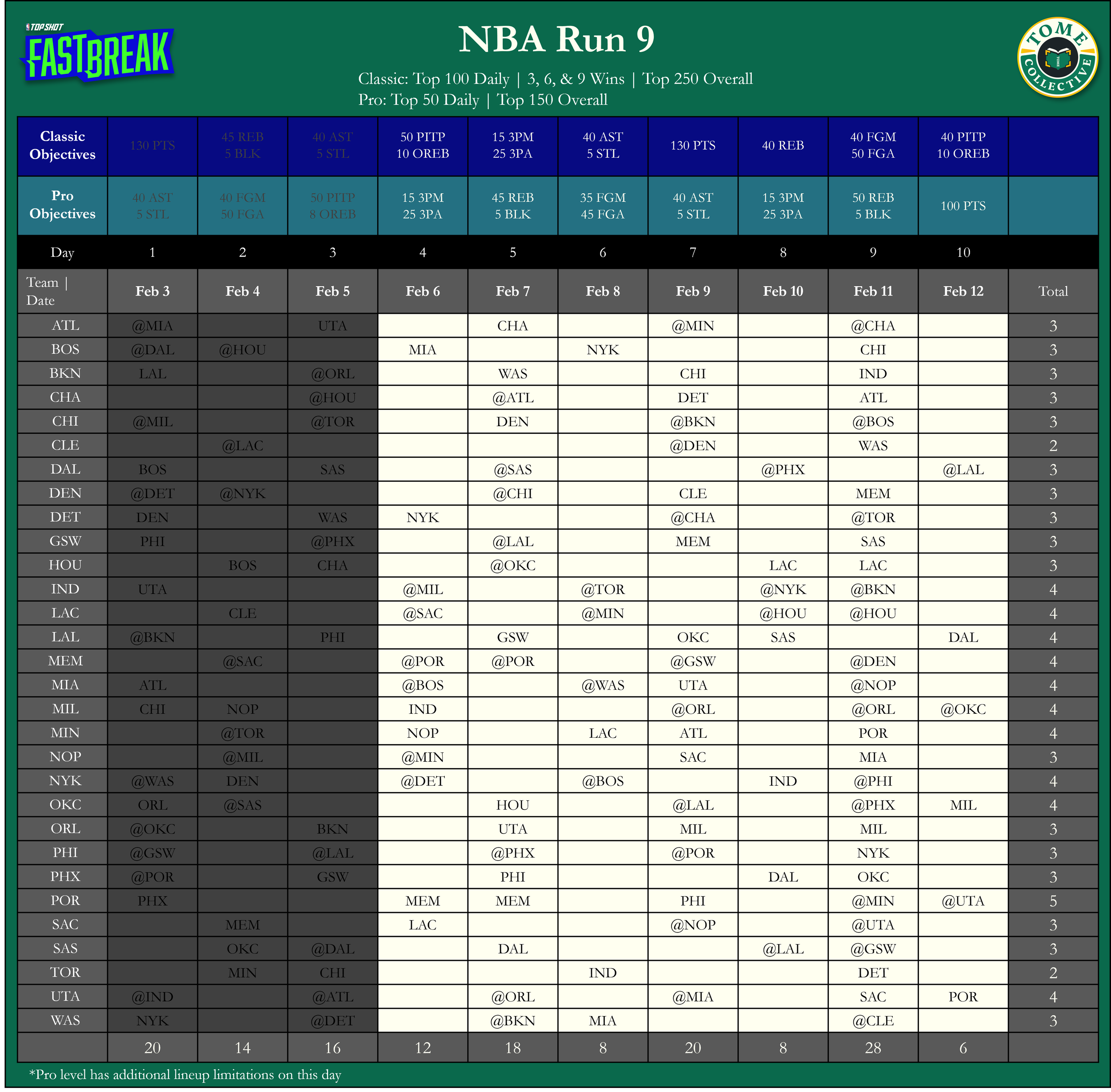 Today you’ll need five (5) players who will score 50 points in the paint and gather 10 offensive rebounds, which means each player will need to average 10.0 PITP & 2.0 OREB. These two objectives take place on the offensive end of the court, but a player could gather a little of both during each possession. There are a number of players who are proficient in each and, of course, there are those who thrive in one category more than the other. A balanced mix and a successful captain will help you win the day.