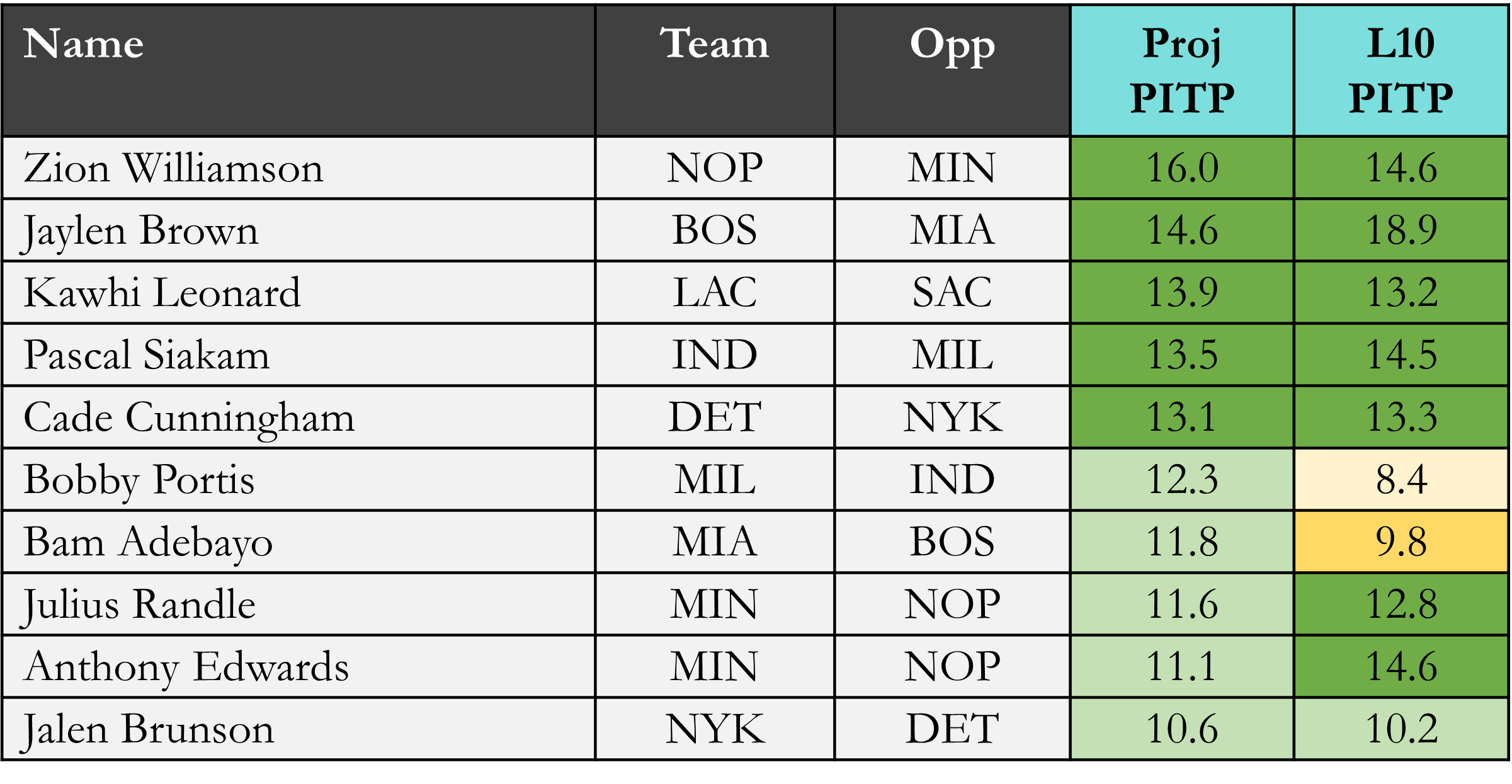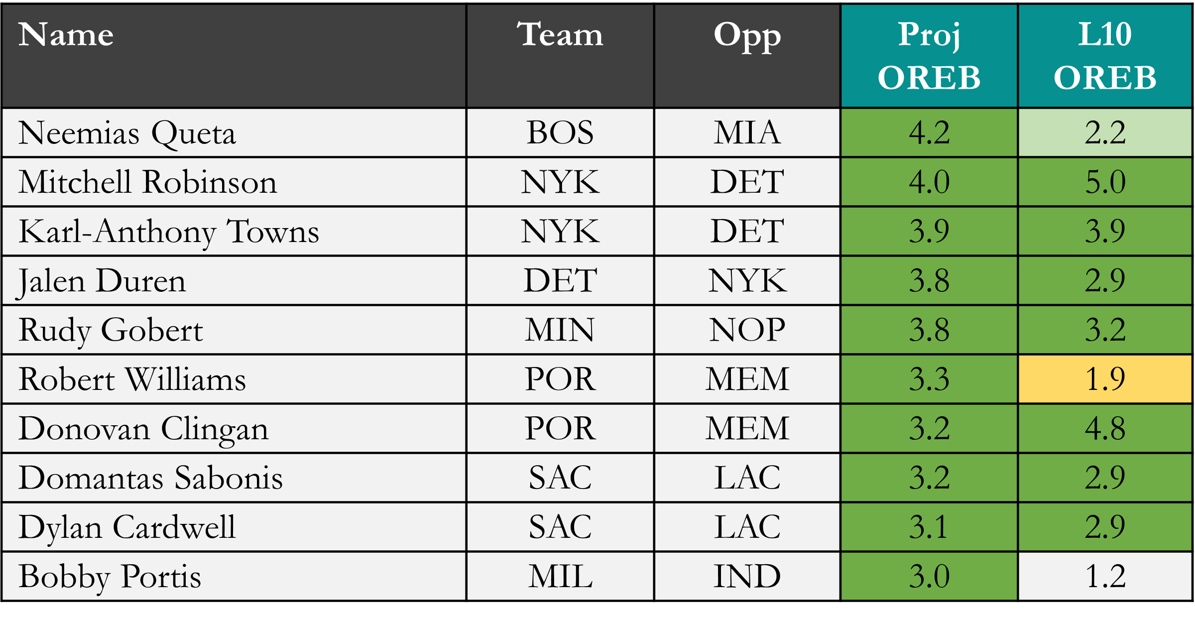 Top players in points in the paint & offensive rebounds according to Rotowire & NBA.com, which is available in the table(s) below. Overall rank is based on daily projections, last 10 average, and season averages, which is stack ranked amongst peers for each objective. When there is a single objective, the three data points are still used to stack rank the players vs. ranking solely on projections. For tome+ members, all active player stats are available in the provided data file. Omission of certain players would be based on injuries at the time of data pull.