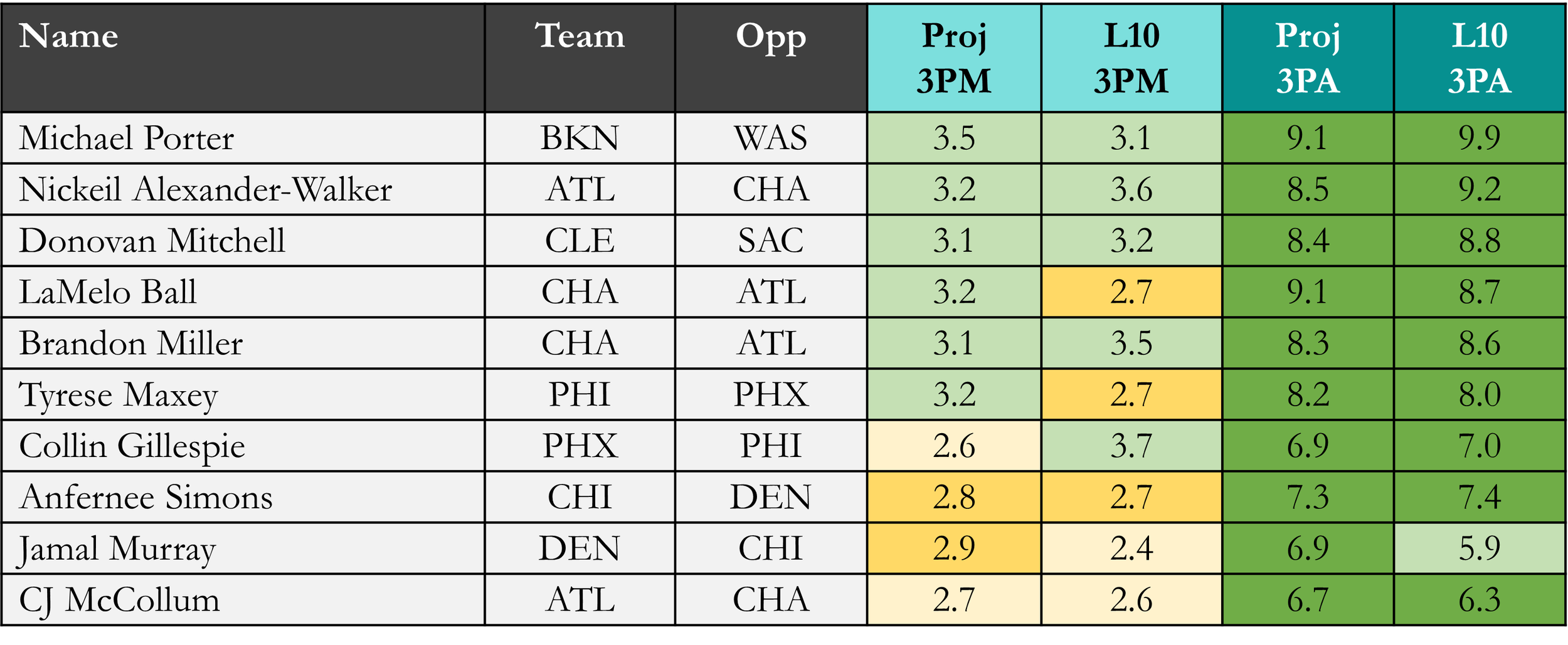 Top players in three pointers made & three point attempts according to Rotowire & NBA.com, which is available in the table(s) below. Overall rank is based on daily projections, last 10 average, and season averages, which is stack ranked amongst peers for each objective. When there is a single objective, the three data points are still used to stack rank the players vs. ranking solely on projections. For tome+ members, all active player stats are available in the provided data file. Omission of certain players would be based on injuries at the time of data pull.