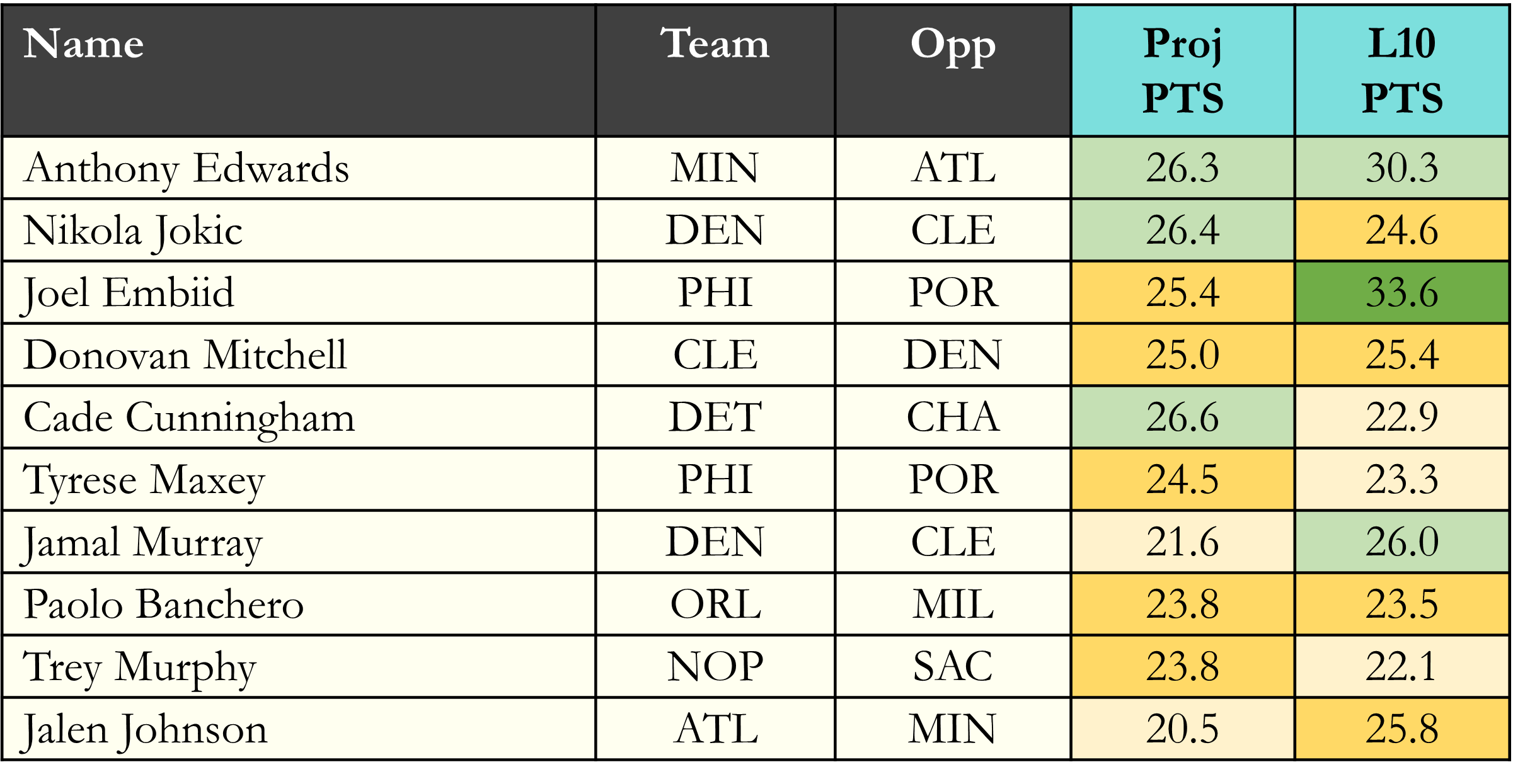 Top players in points scored according to Rotowire & NBA.com, which is available in the table(s) below. Overall rank is based on daily projections, last 10 average, and season averages, which is stack ranked amongst peers for each objective. When there is a single objective, the three data points are still used to stack rank the players vs. ranking solely on projections. For tome+ members, all active player stats are available in the provided data file. Omission of certain players would be based on injuries at the time of data pull.