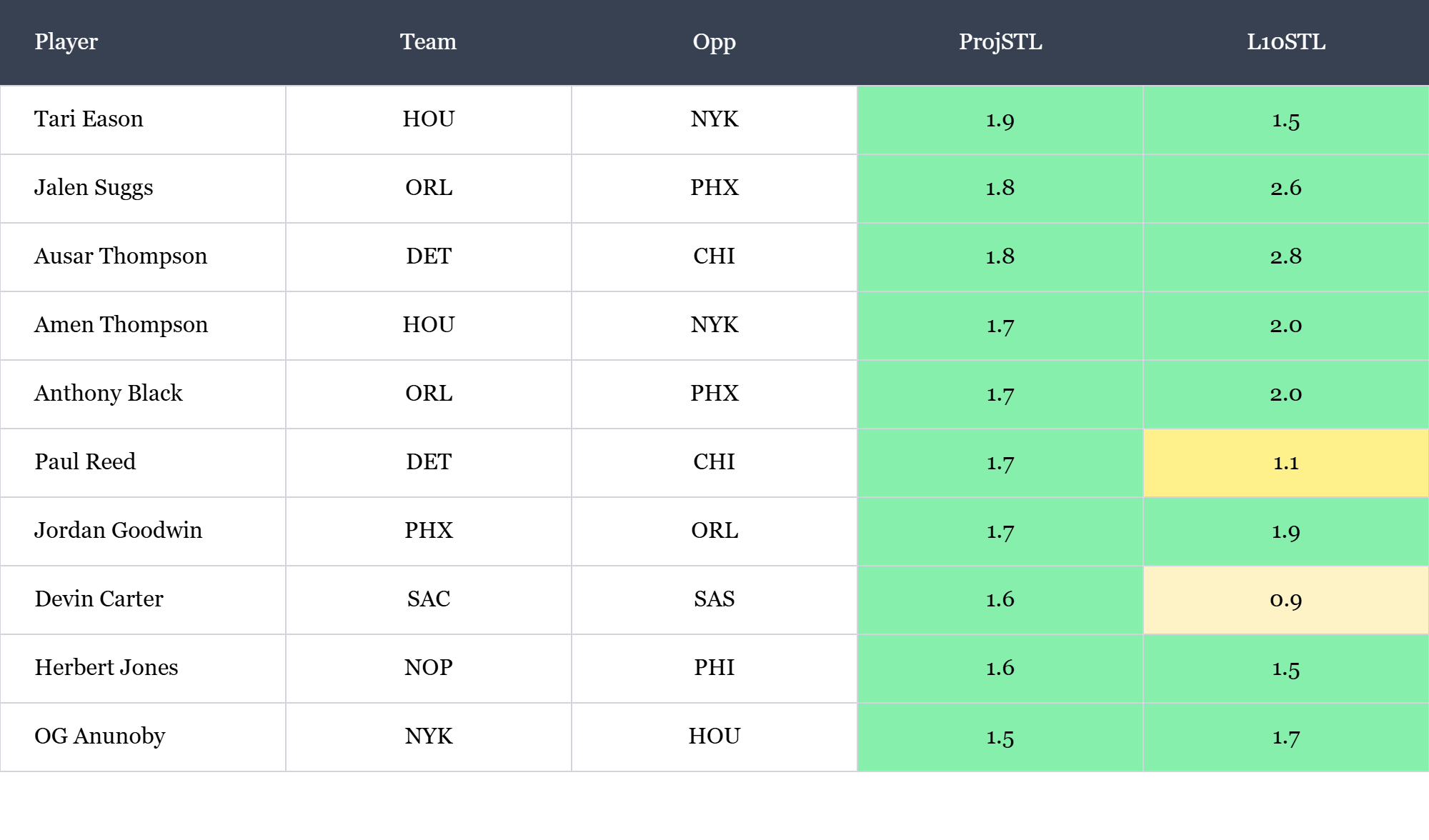 Top players in assists & steals according to Rotowire & NBA.com, which is available in the table(s) below. Overall rank is based on daily projections, last 10 average, and season averages, which is stack ranked amongst peers for each objective. When there is a single objective, the three data points are still used to stack rank the players vs. ranking solely on projections. For tome+ members, all active player stats are available in the provided data file. Omission of certain players would be based on injuries at the time of data pull.