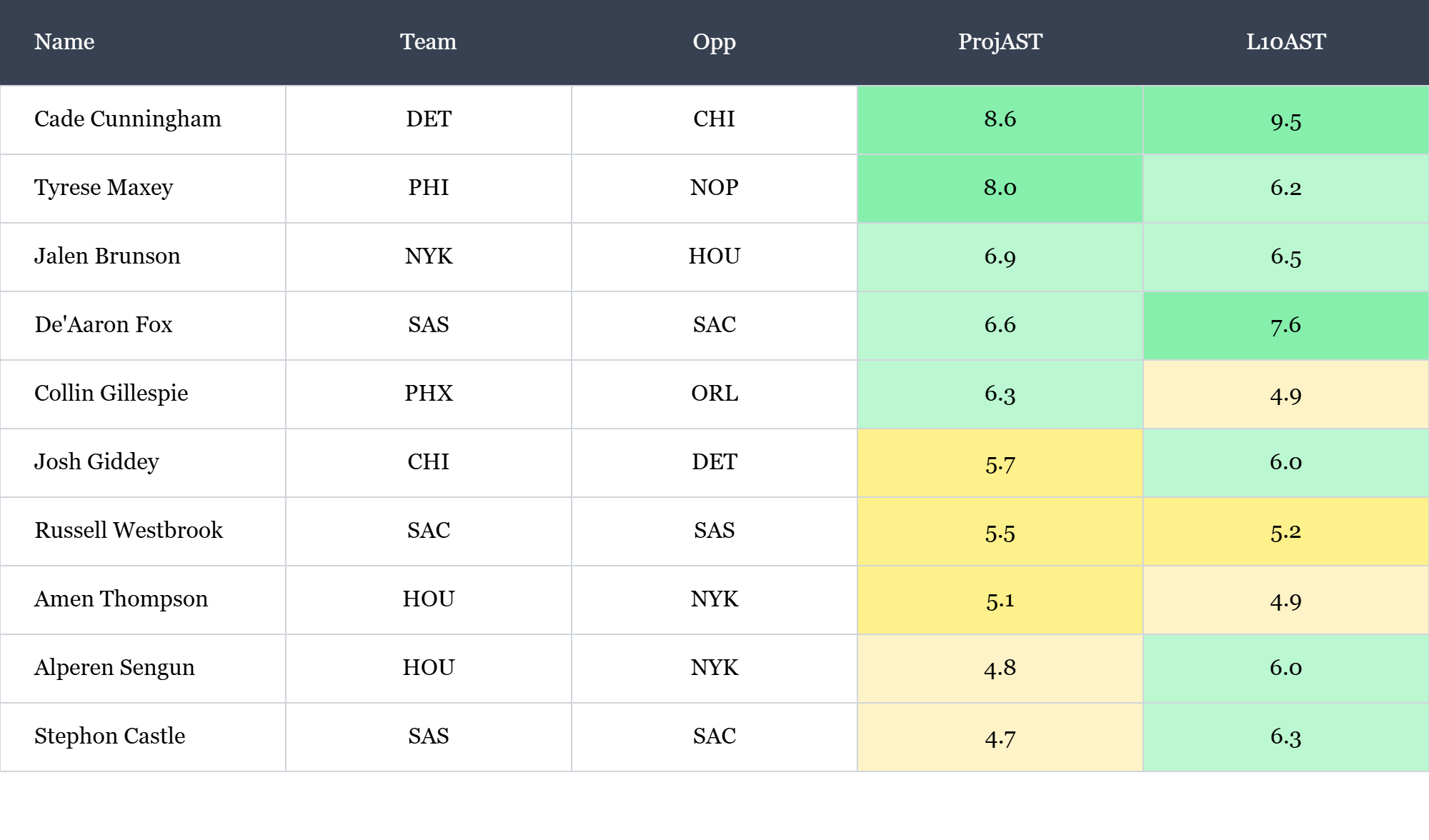 Today you’ll need five (5) players who will distribute 35.0 or more assists and accumulate 5.0 or more steals, which means each player will need to average 7.0 AST & 1.0 STL. The assists & steals days have shown to be major hurdles for success in Fast Break and today will likely be no different considering there are only 12 teams in action today. Cade Cunningham will be heavily utilized considering his ability to set up his teammates while sniping lazy passes.