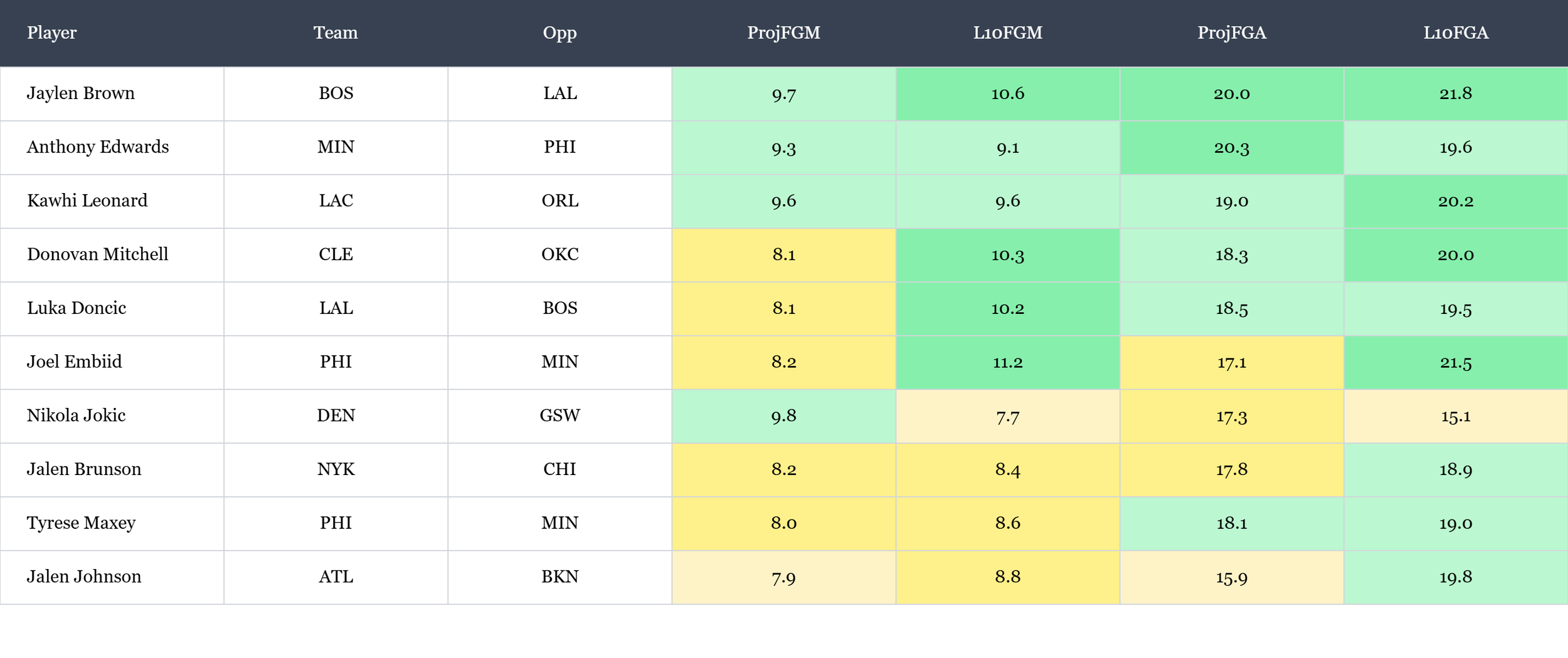 Top players in field goals made & field goal attempts according to Rotowire & NBA.com, which is available in the table(s) below. Overall rank is based on daily projections, last 10 average, and season averages, which is stack ranked amongst peers for each objective. When there is a single objective, the three data points are still used to stack rank the players vs. ranking solely on projections. For tome+ members, all active player stats are available in the provided data file. Omission of certain players would be based on injuries at the time of data pull.