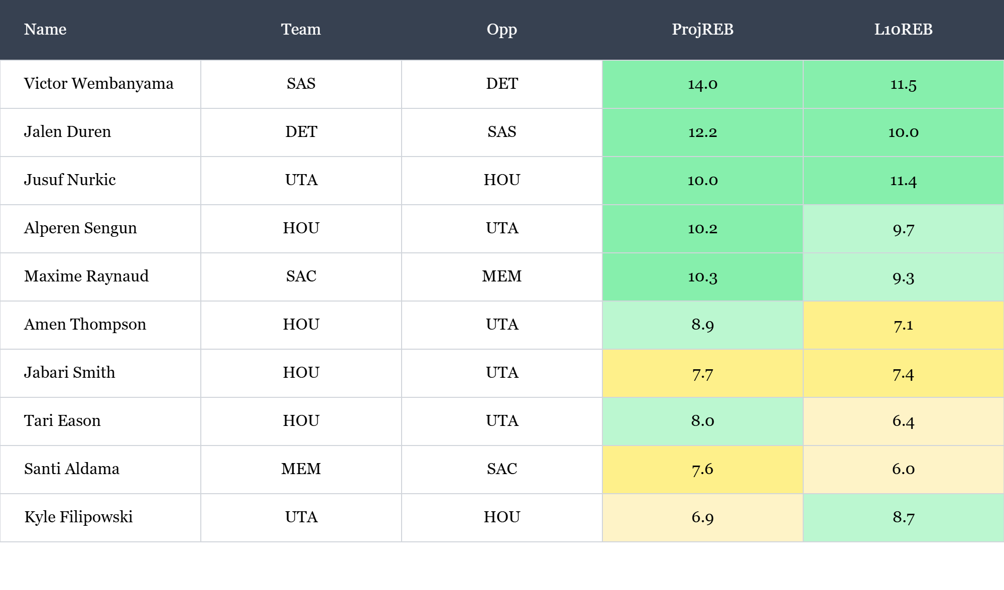 Top players in rebounds according to Rotowire & NBA.com, which is available in the table(s) below. Overall rank is based on daily projections, last 10 average, and season averages, which is stack ranked amongst peers for each objective. When there is a single objective, the three data points are still used to stack rank the players vs. ranking solely on projections. For tome+ members, all active player stats are available in the provided data file. Omission of certain players would be based on injuries at the time of data pull.