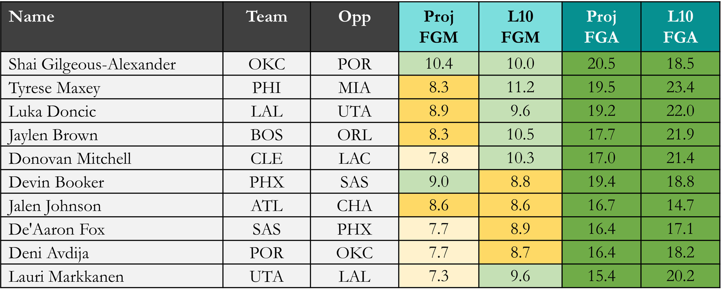 Top players in field goals made & field goal attempts according to Rotowire & NBA.com, which is available in the table(s) below. Overall rank is based on daily projections, last 10 average, and season averages, which is stack ranked amongst peers for each objective. When there is a single objective, the three data points are still used to stack rank the players vs. ranking solely on projections. For tome+ members, all active player stats are available in the provided data file. Omission of certain players would be based on injuries at the time of data pull.