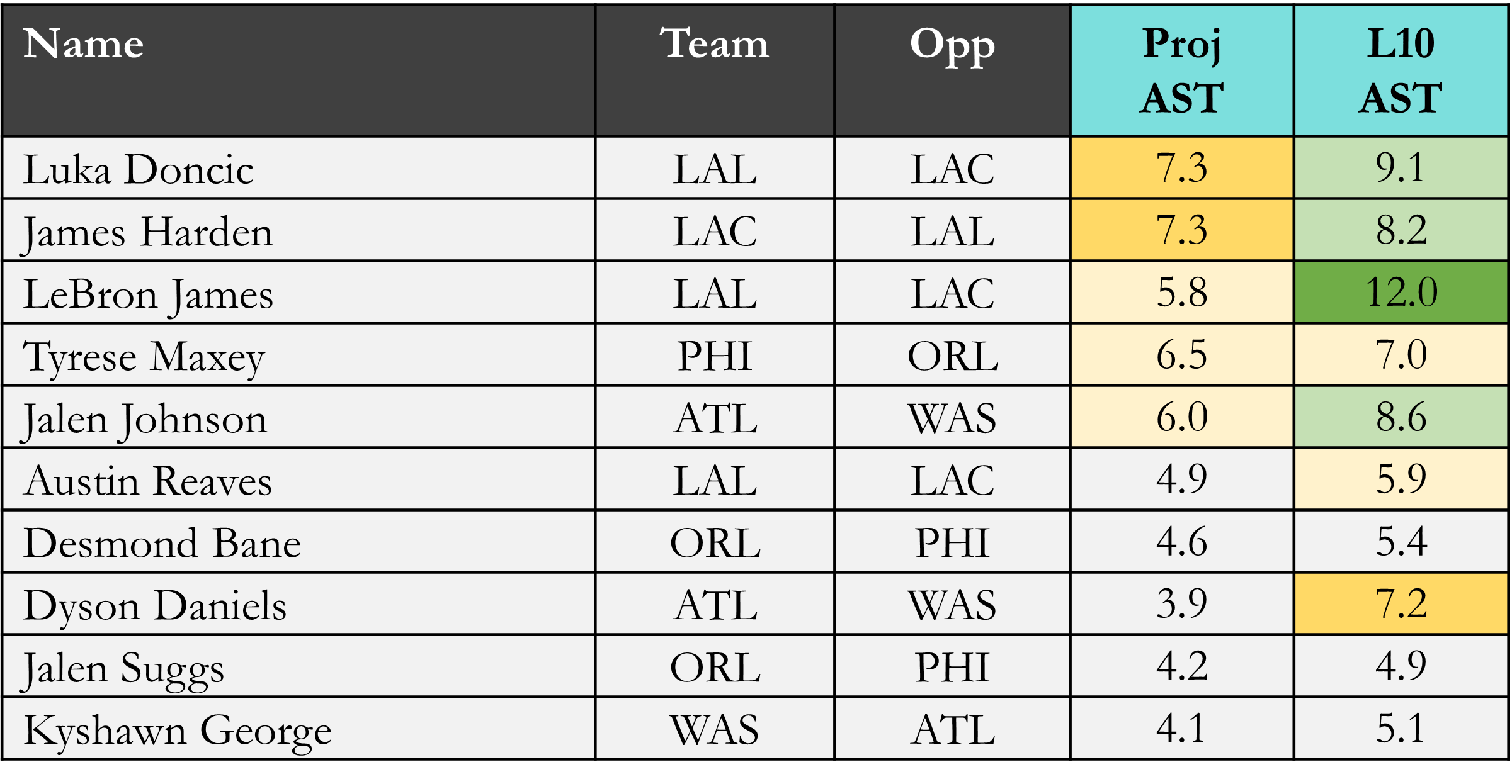 Top players in assists according to Rotowire & NBA.com, which is available in the table(s) below. Overall rank is based on daily projections, last 10 average, and season averages, which is stack ranked amongst peers for each objective. When there is a single objective, the three data points are still used to stack rank the players vs. ranking solely on projections. For tome+ members, all active player stats are available in the provided data file. Omission of certain players would be based on injuries at the time of data pull.